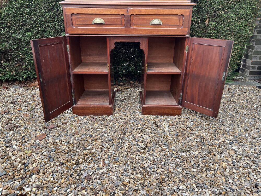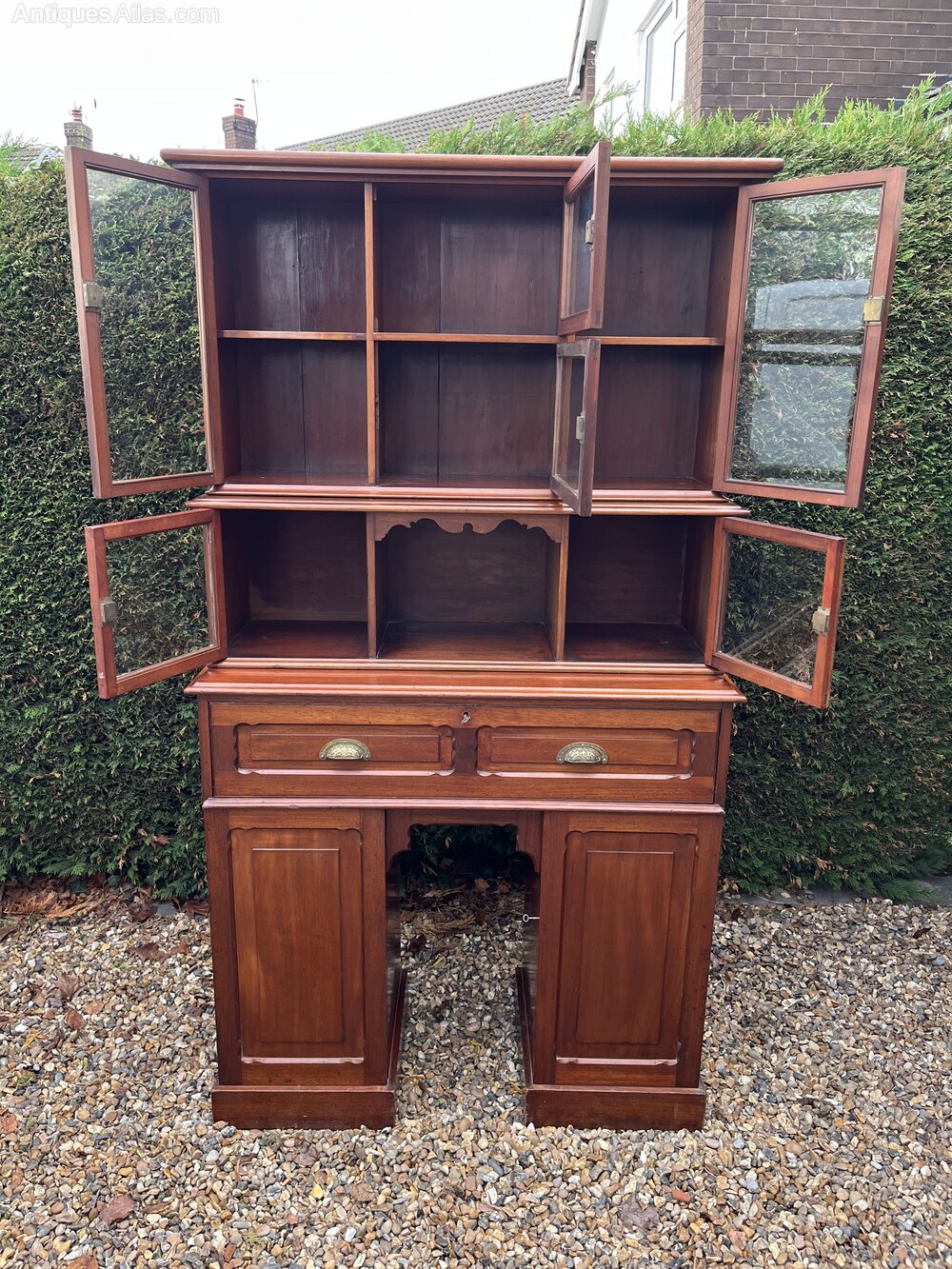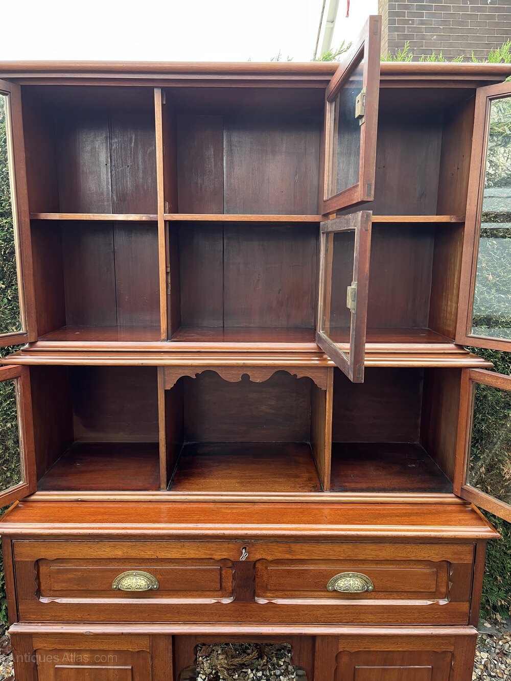 It has original brass fittings throughout and decorative moulding to the door frames and drawer front in an Arts and Crafts design. The glazing is also original. The secretaire splits into three sections. The sections connect with dowel locators.