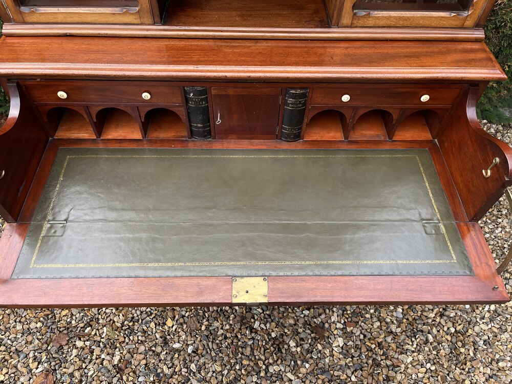 The bookcase has six glazed cupboards with working locks and key. The base unit has two pillar cupboards with working locks and key. The bureau section opens with a spring lock and key. The front hinges down to reveal the internal bureau which has a leather tooled writing surface, six pigeon holes, two drawers with bone handles and a central cupboard with working lock and key. Additionally there are also two dummy books which can be withdrawn to reveal secret compartments.