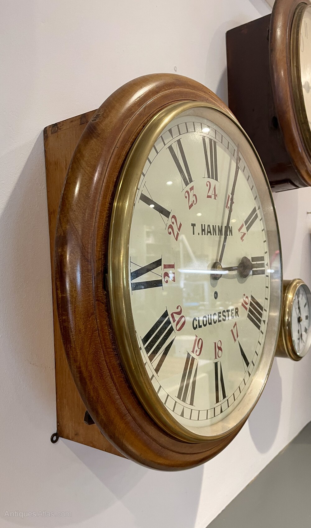 A late Victorian mahogany circular cased wall timepiece with eight day single fusee movement, the repainted 14-inch circular dial with black Roman hour numerals and inner red Arabic 24-hour ring and inscribed 'T. Hanman Gloucester', within a moulded circular surround, case diameter 43.5cm, with pendulum and case key.