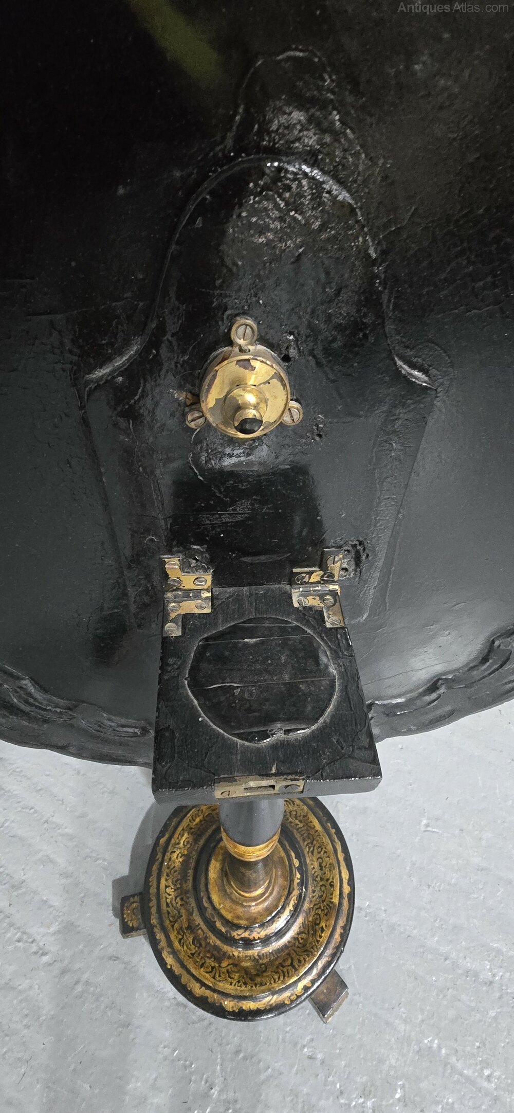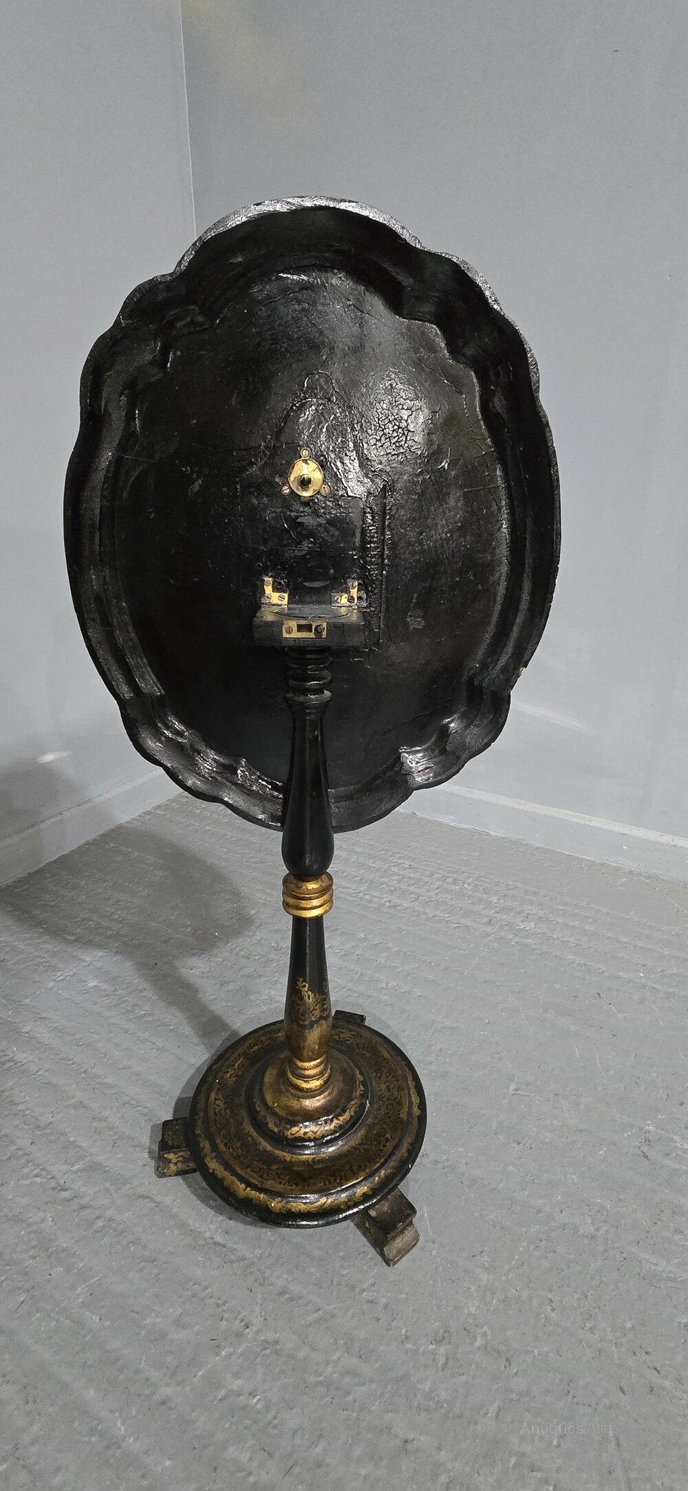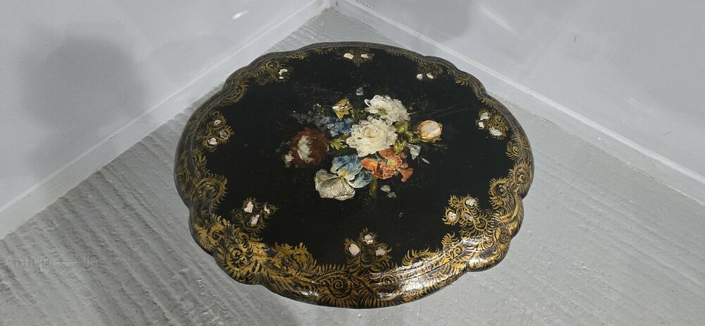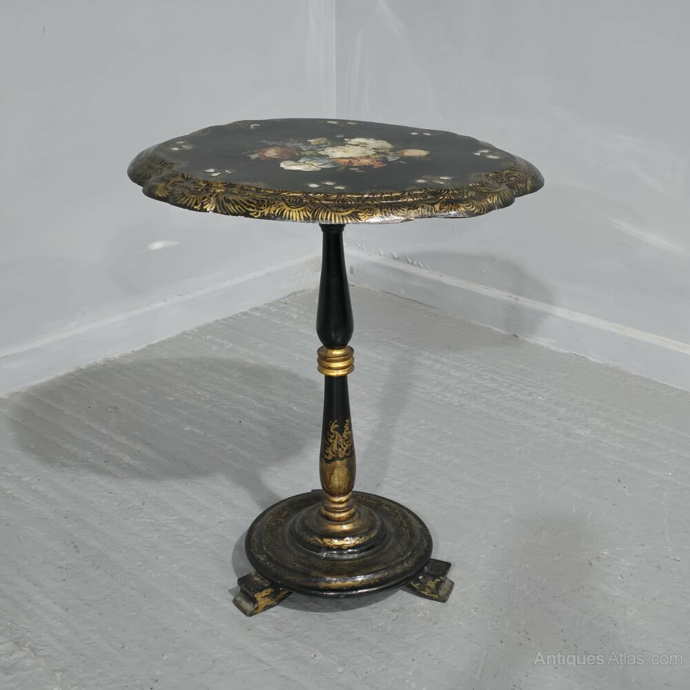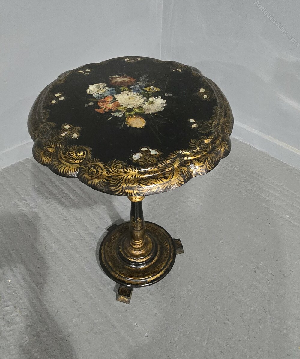 A very nice Victorian papier mache flip top pedestal table, hand painted with mother of pearl inlay, in very good overall original condition.
