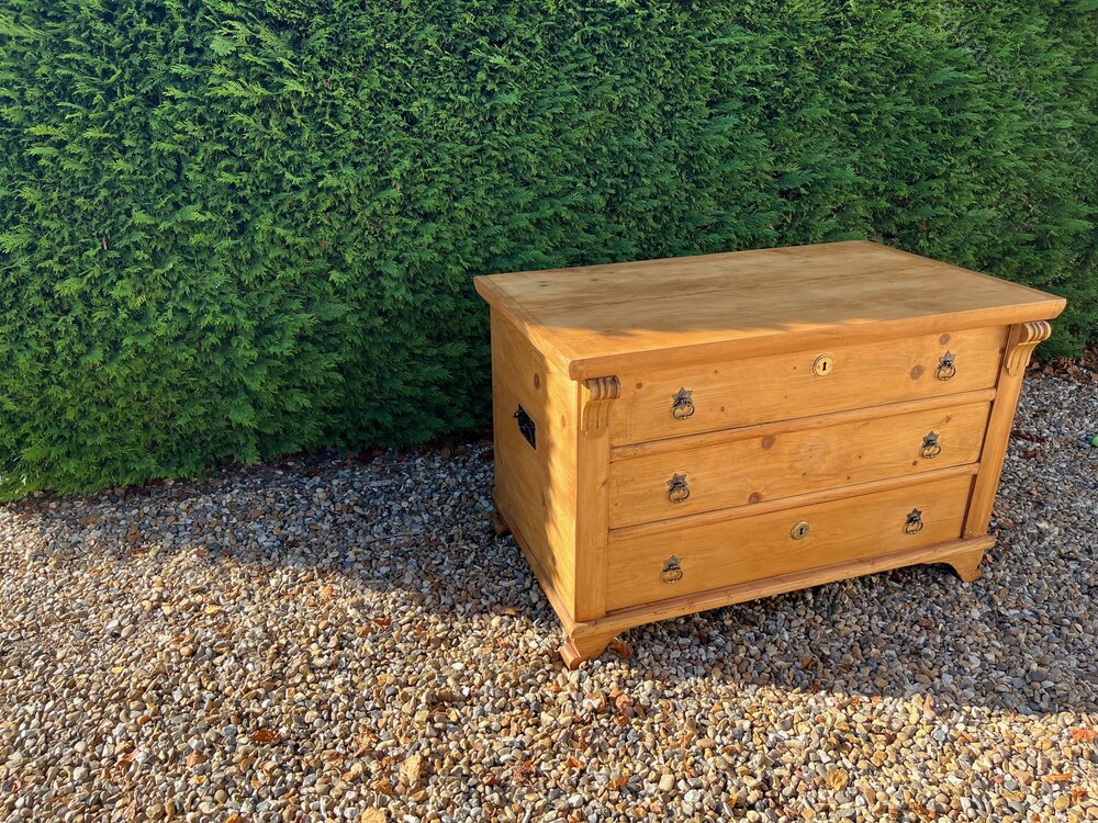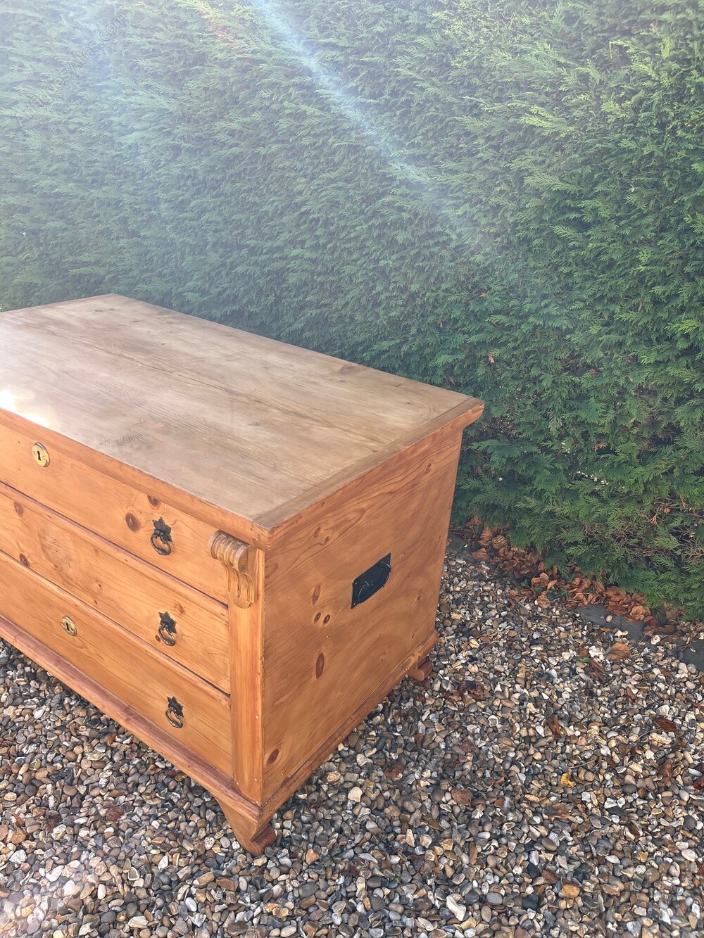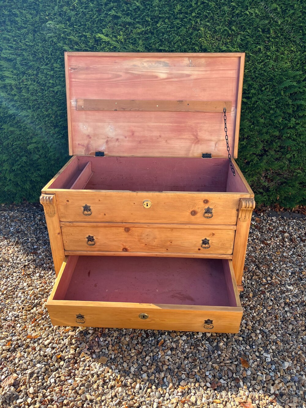 A large Victorian pine coffer/mule chest. It has one drawer at the base with two false drawers above. It is 120cm long, 68cm wide and 73cm high. It has marks and wear commensurate with its age and previous use.