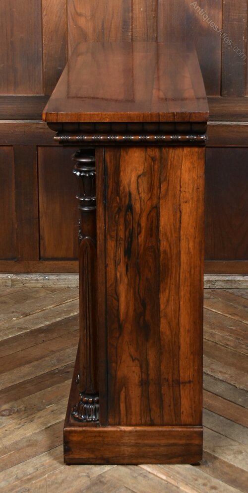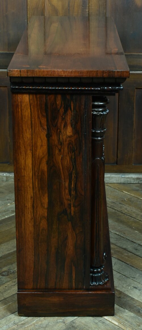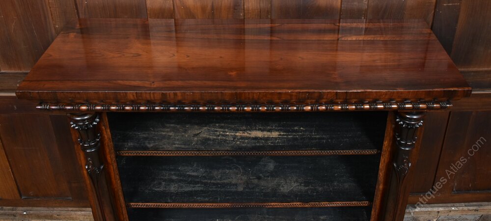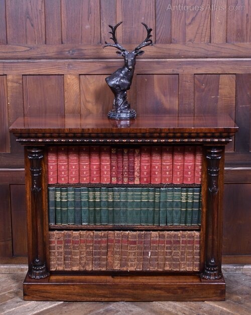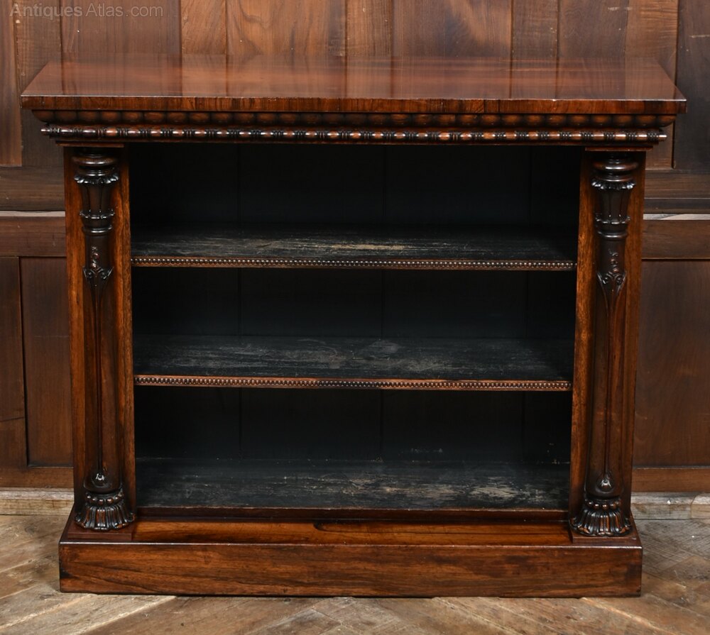 A beautiful Victorian rosewood open bookcase in excellent antique condition. Its two adjustable shelves are framed by elegantly carved columns and lined with velvet, lightly worn with age but still entirely functional. Strongly constructed, the bookcase offers both useful storage and decorative appeal, ideal for showcasing books or cherished items. With its timeless rosewood finish, graceful proportions, and intricate detailing, this piece reflects the artistry of Victorian craftsmanship and would sit perfectly in a study, library, or period home.
