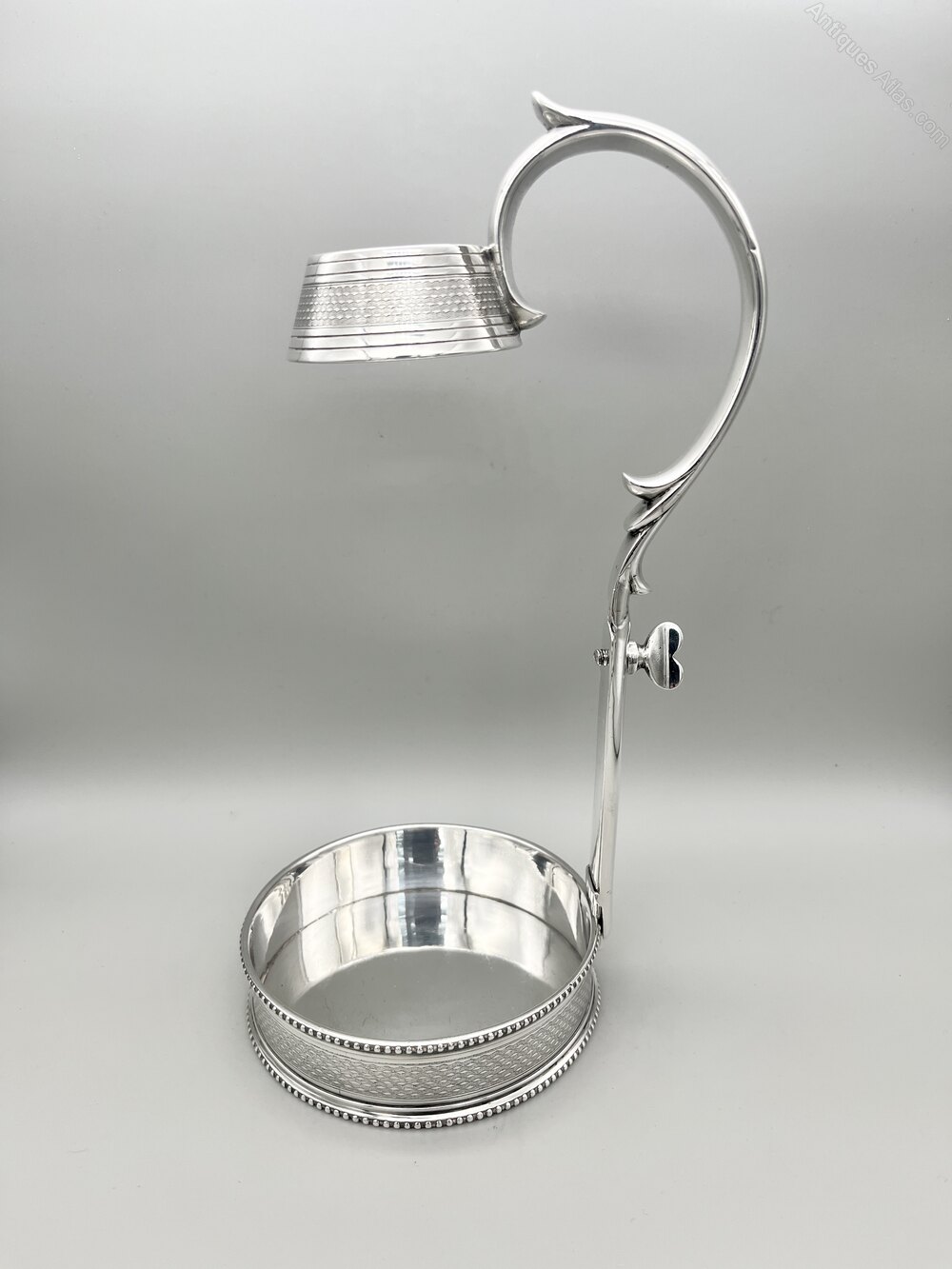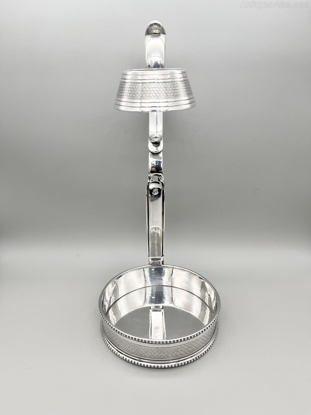 This is an elegant and practical early Victorian Silver Plate Wine Bottle Holder. The holder has a circular base with engine turned decoration around the body and beaded rims to top and bottom. The handle is adjustable to fit bottles of varying heights and the collar has matching engine turned decoration. Please note the wine bottle is for demonstration purposes only and is not included.