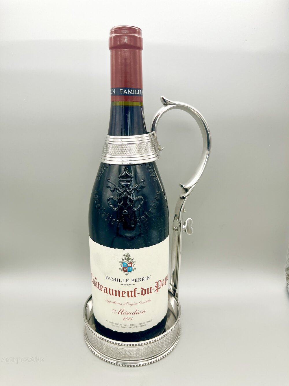 The bottle holder was made in Birmingham by George R. Collis & Co and dates to around the 1840s to 1860s. George Richmond Collis acquired the business of renowned Birmingham silversmith Sir Edward Thomason after his retirement in 1835. Collis continued the high quality silver work of his predecessor and also began electroplating in the 1840s. The company participated in the Great Exhibition in 1851 and opened a London showroom in Regent Street. In 1888 the firm was taken over by S.W. Smith & Co.