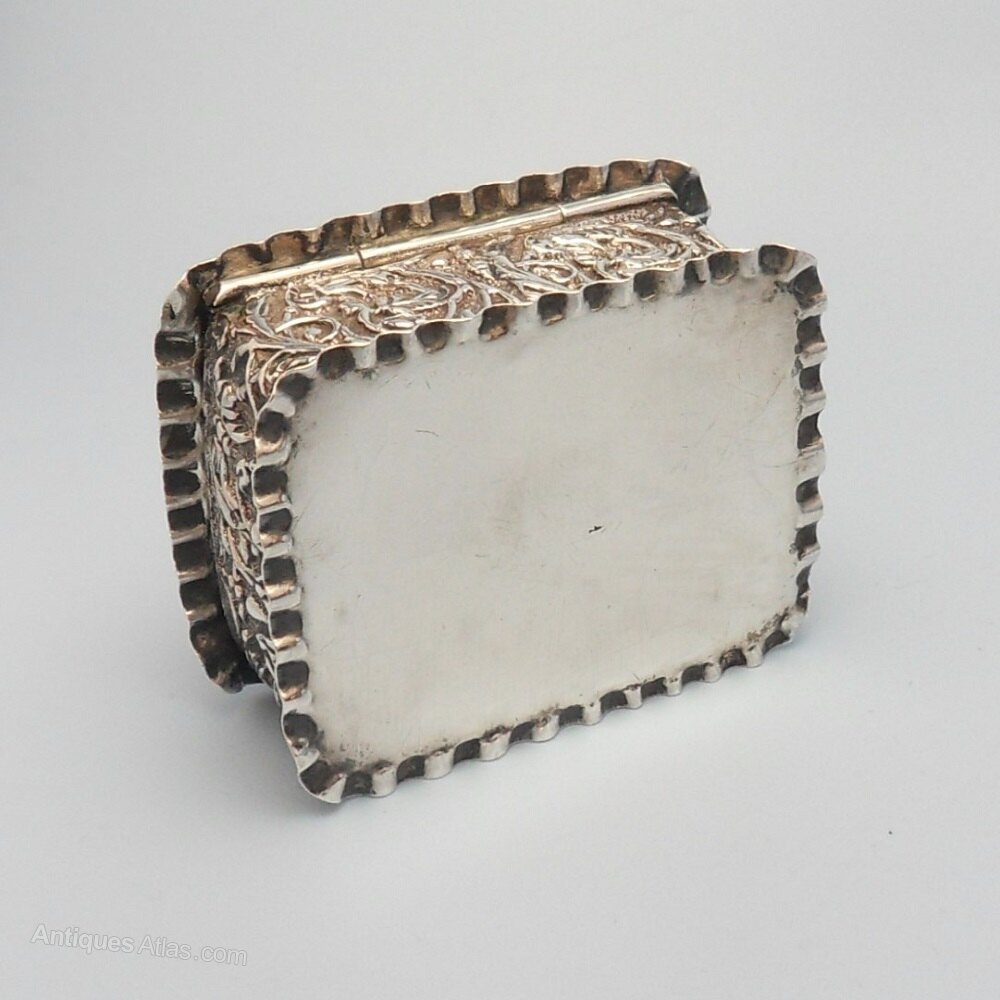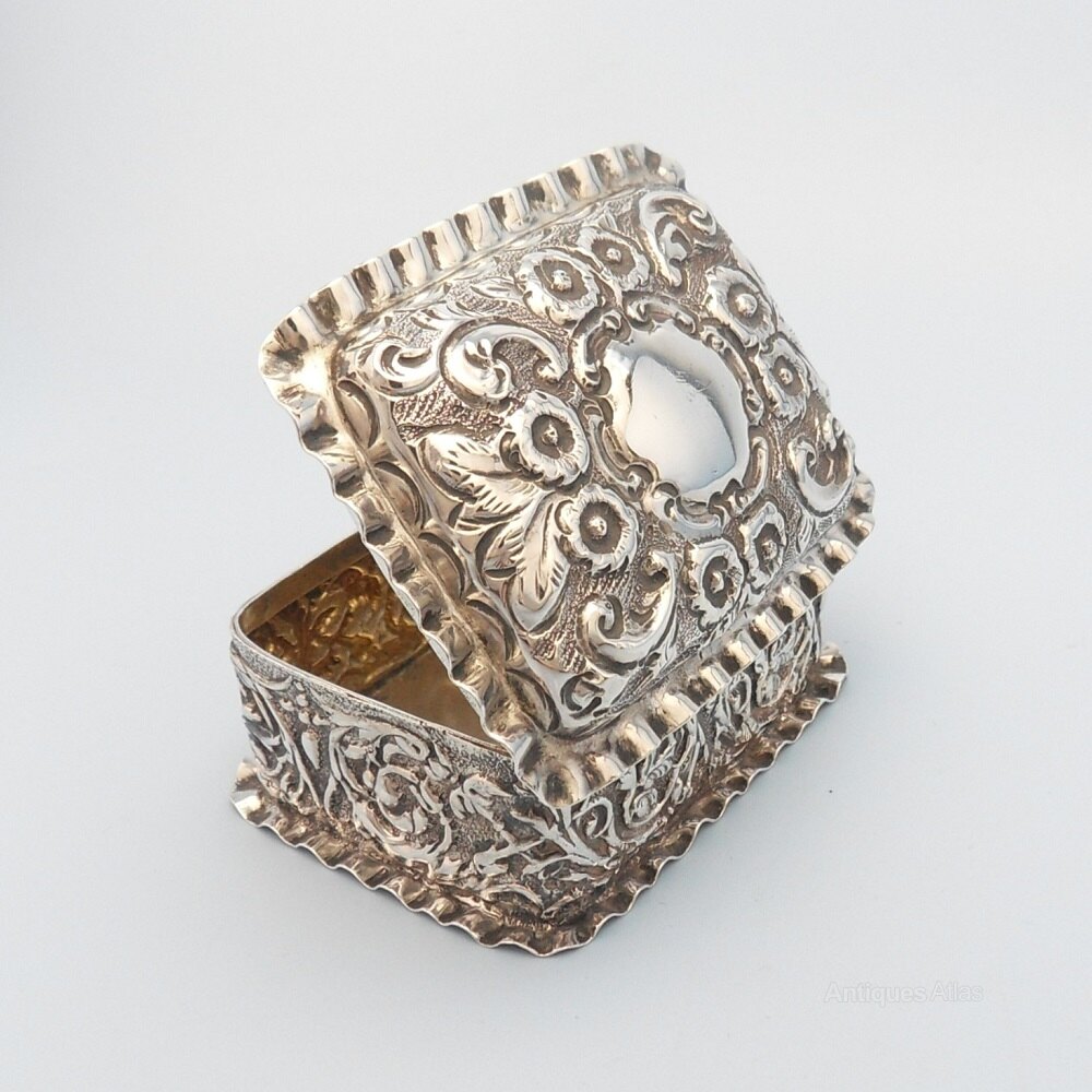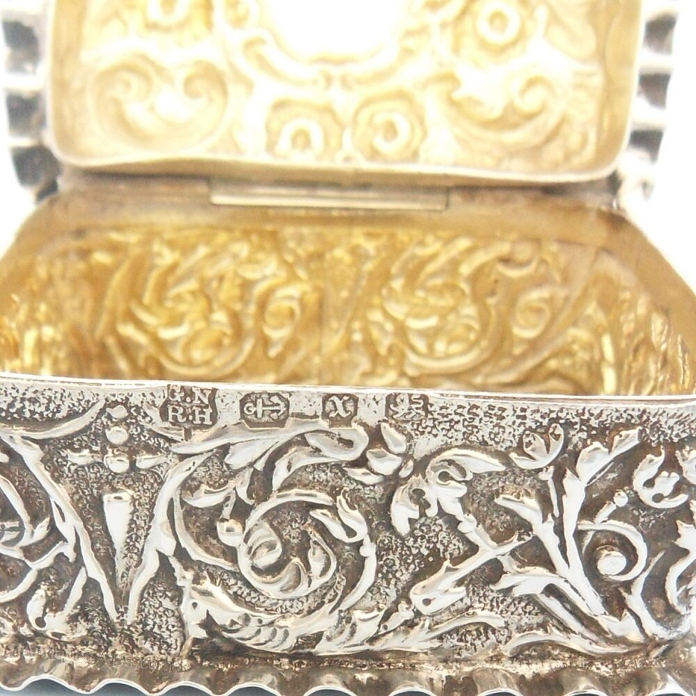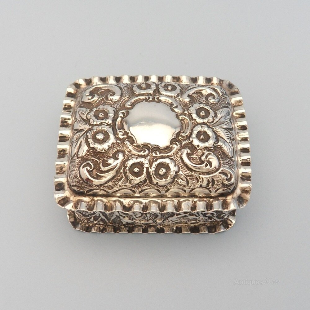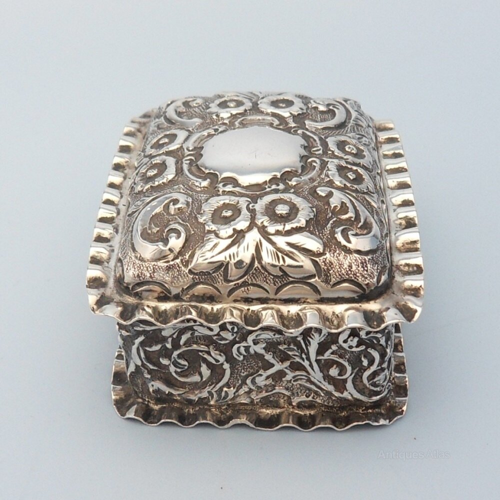 A very pretty and nicely proportioned silver trinket box, beautifully embossed to the lid with an empty cartouche in the centre and a frilled edge. The sides are also embossed sides with flowers and swirls. The hinged lid opens and closes softly rather than snapping shut. Inside is a lovely gilded finish. Hallmarks are clearly visible on the front of the box for the Birmingham Assay office with a date mark for 1897 and Lion Passant indicating sterling silver, along with the silver maker's mark: George Nathan & Ridley Hayes. Part marks can be seen on the inside lip of the lid.