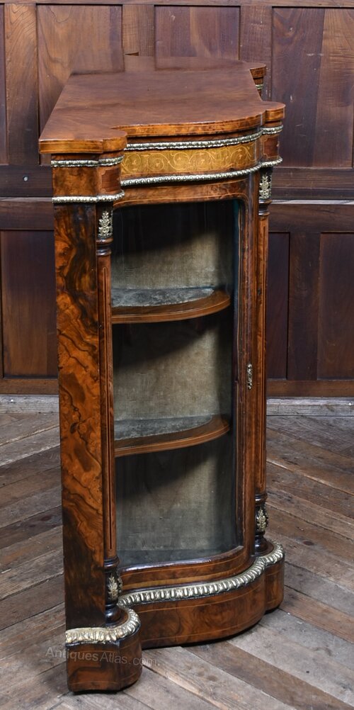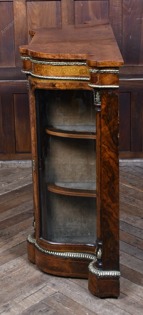 Superb Victorian credenza crafted from richly figured walnut, its surfaces displaying striking burr veneers and intricate marquetry inlays. The central panel is adorned with a hand-painted porcelain plaque depicting a classical female portrait, framed by ornate gilt mounts. On either side, curved glass display cabinets with original shelves provide elegant spaces for treasured objects, Decorative ormolu embellishments highlight the columns and edges, enhancing the cabinet’s luxurious appeal. Presented in excellent antique condition, with only light wear consistent with age, this credenza combines practicality with artistry. Its warm walnut patina, refined detailing, and balanced proportions make it a statement piece, equally suited to a collector’s interior or as a dramatic focal point in a study, drawing room, or formal setting.