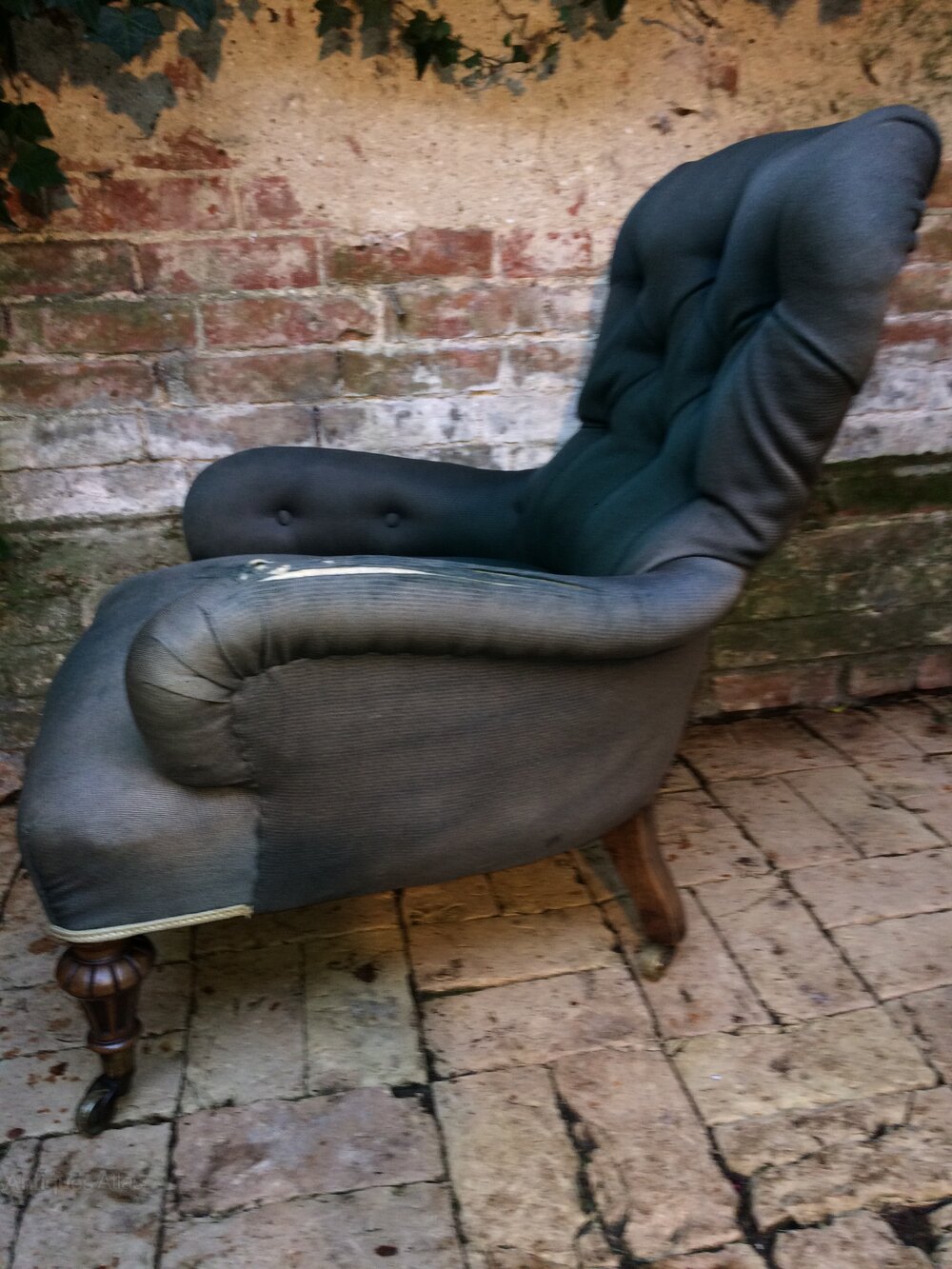 A 19th century Walnut Gillow iron back armchair in good solid condition, stamped, retaining original brass castors ready for re-covering. Please get in touch for a quote for upholstery, three metres required, or any other enquiries or more detailed images.