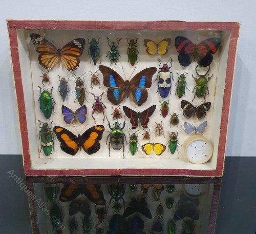 Vintage collection of the most colourful insects in the world c.1930. In display case with preservation dehumidifier.