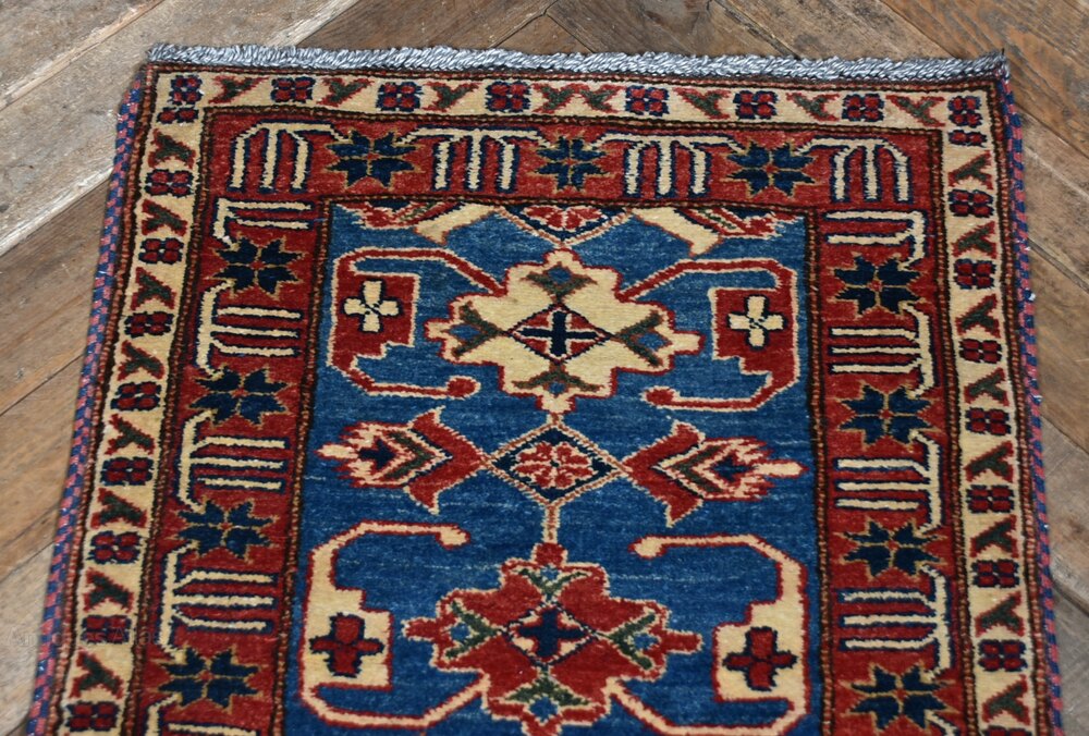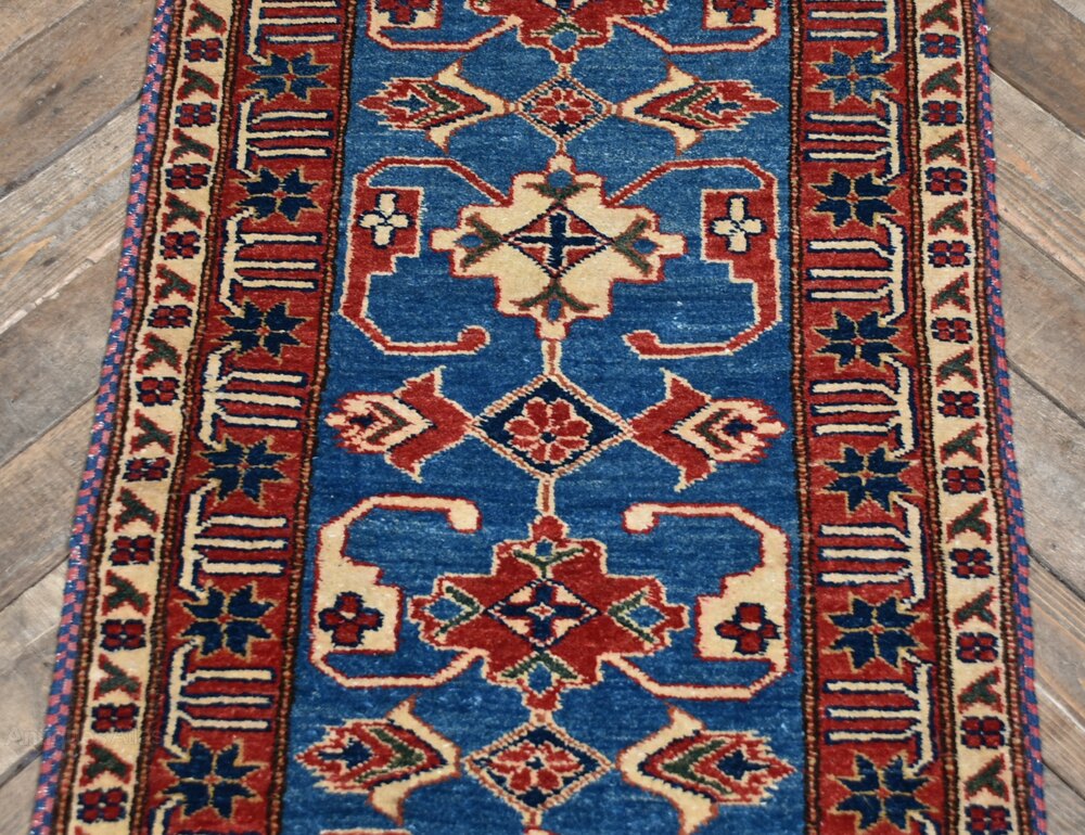 A striking handwoven runner with a rich palette of deep blue, crimson, and cream. The central field is adorned with symmetrical geometric and floral motifs in repeating formation, framed by a vibrant red border with alternating stylised designs. A narrow cream band with delicate accents adds definition and contrast. The craftsmanship is evident in the clarity of pattern and balance of colour, making this a characterful and practical piece—ideal for hallways, landings, or narrow spaces in need of warmth and visual interest.
