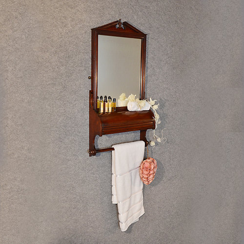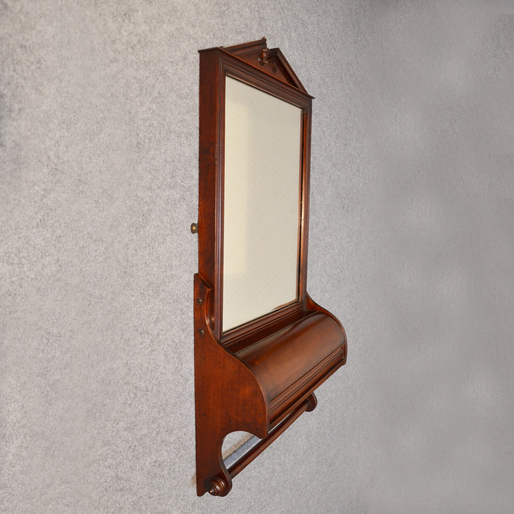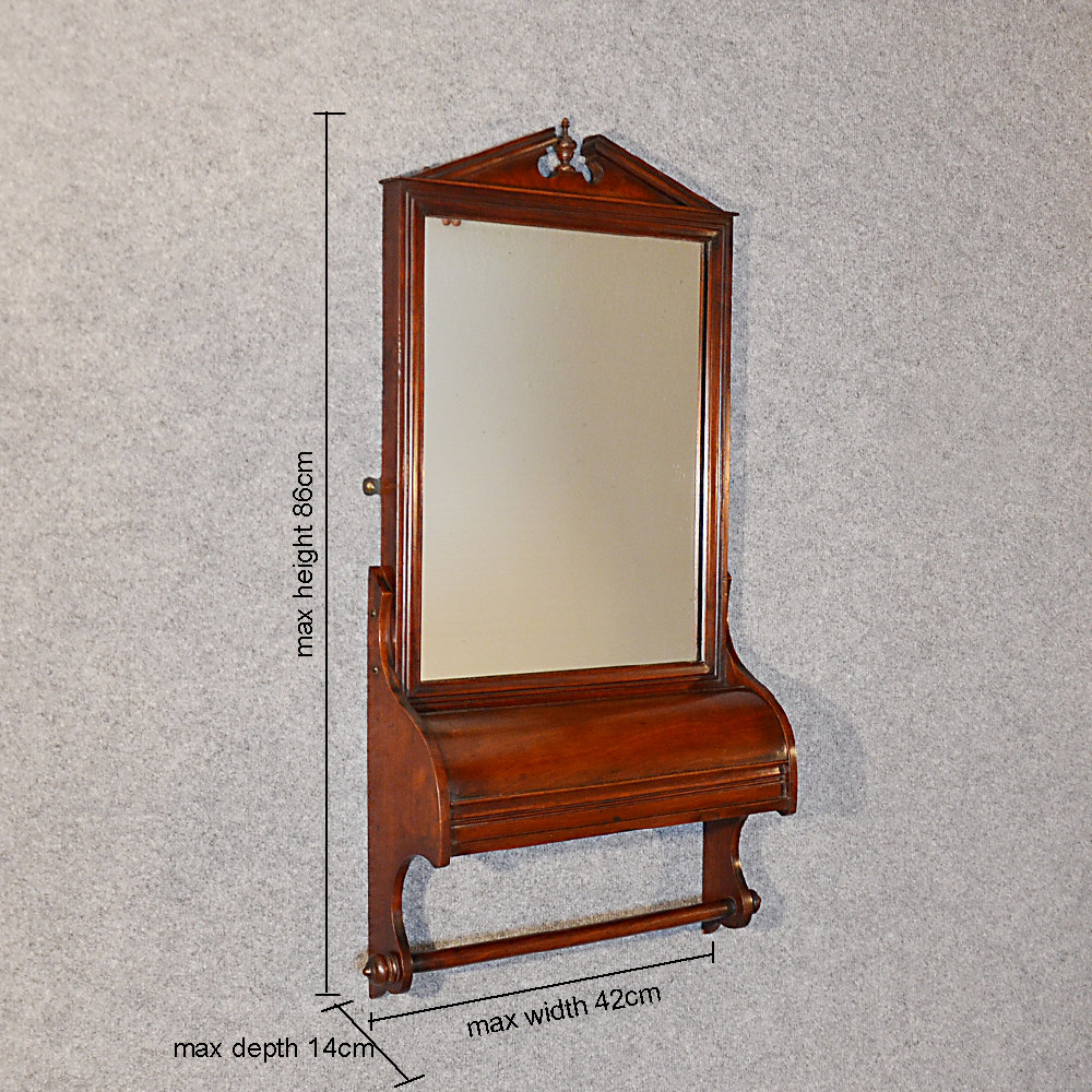 A good mirror plate under a sloping pediment with integral finial resides over a useful storage space. The curved frame supports a further unusual feature in the form of a lower rail.
