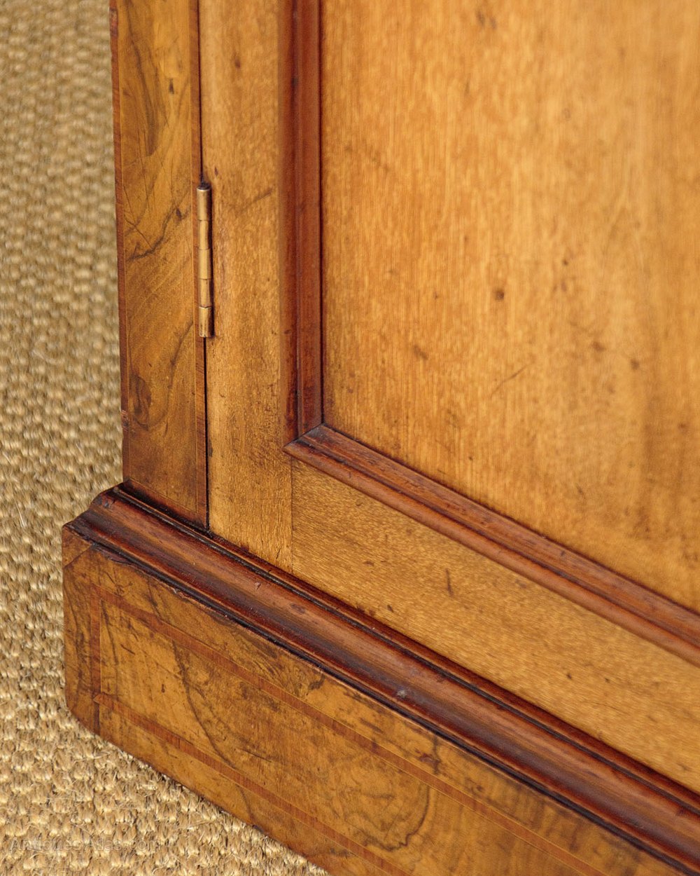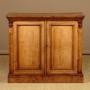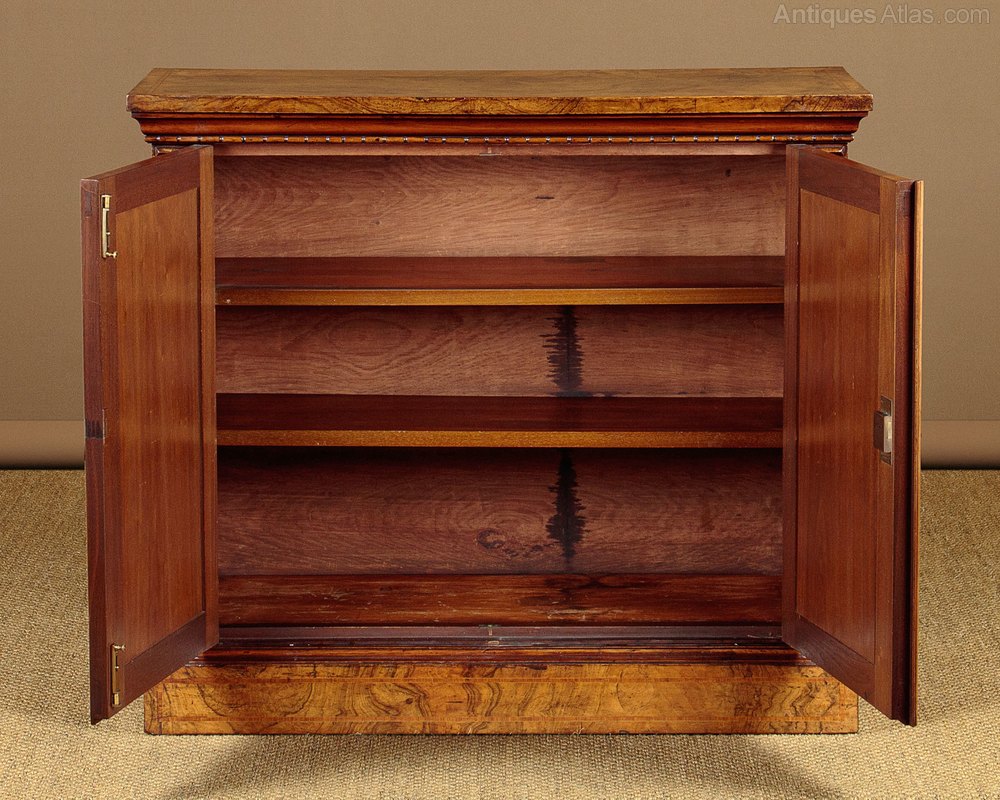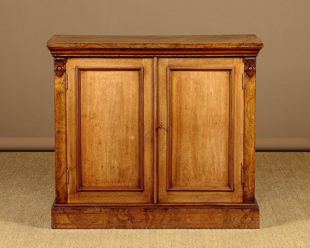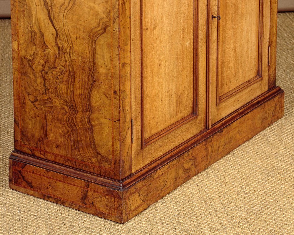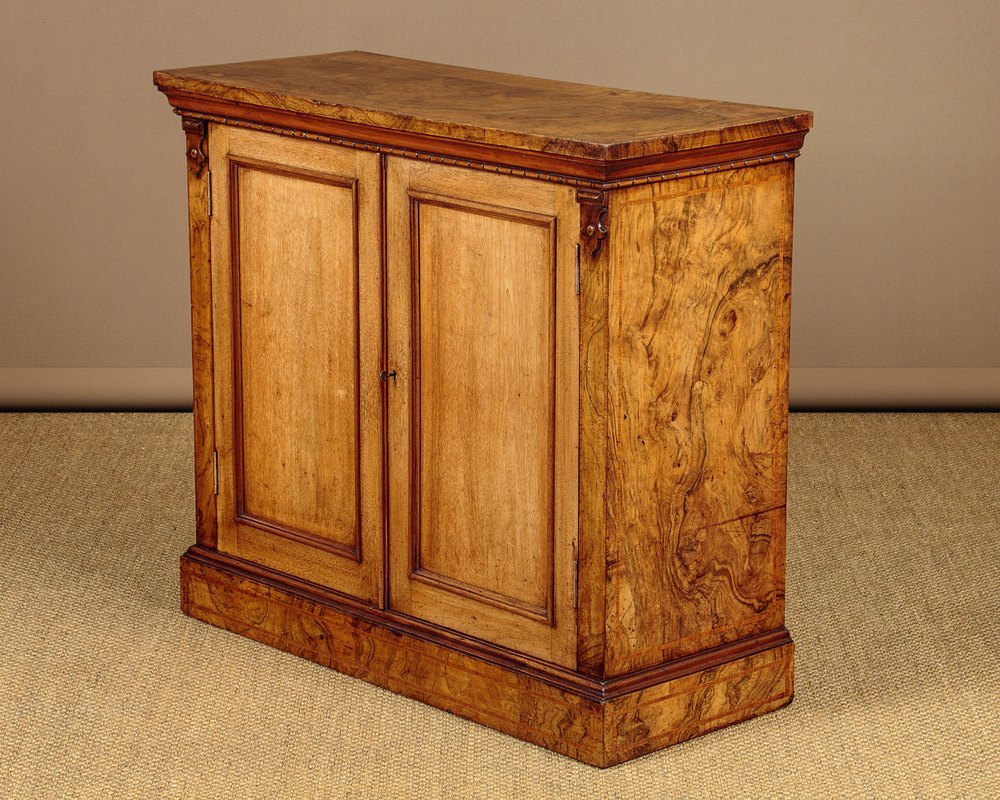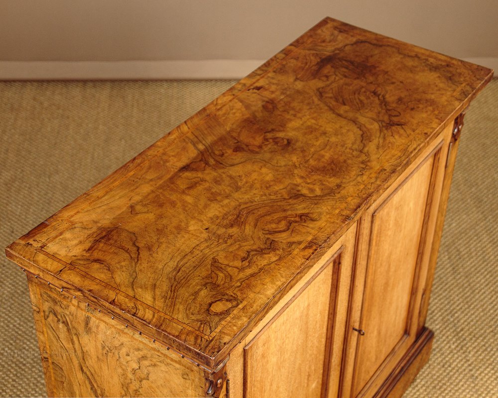 Useful little chiffonier side cabinet in walnut c.1880. Just 37" wide. Burr walnut veneered top with an inlaid crossbanded satinwood border. Over a two door cabinet, fitted with two adjustable shelves inside (depth 11½"). Plain walnut doors, burr walnut veneered sides (on plain walnut groundwork) also with crosbanded inlay. Carved detail above the doors, continued on the sides. Raised on a moulded plinth, also burr veneered. Very good colour and condition, cleaned and waxed in our workshops. Key supplied.