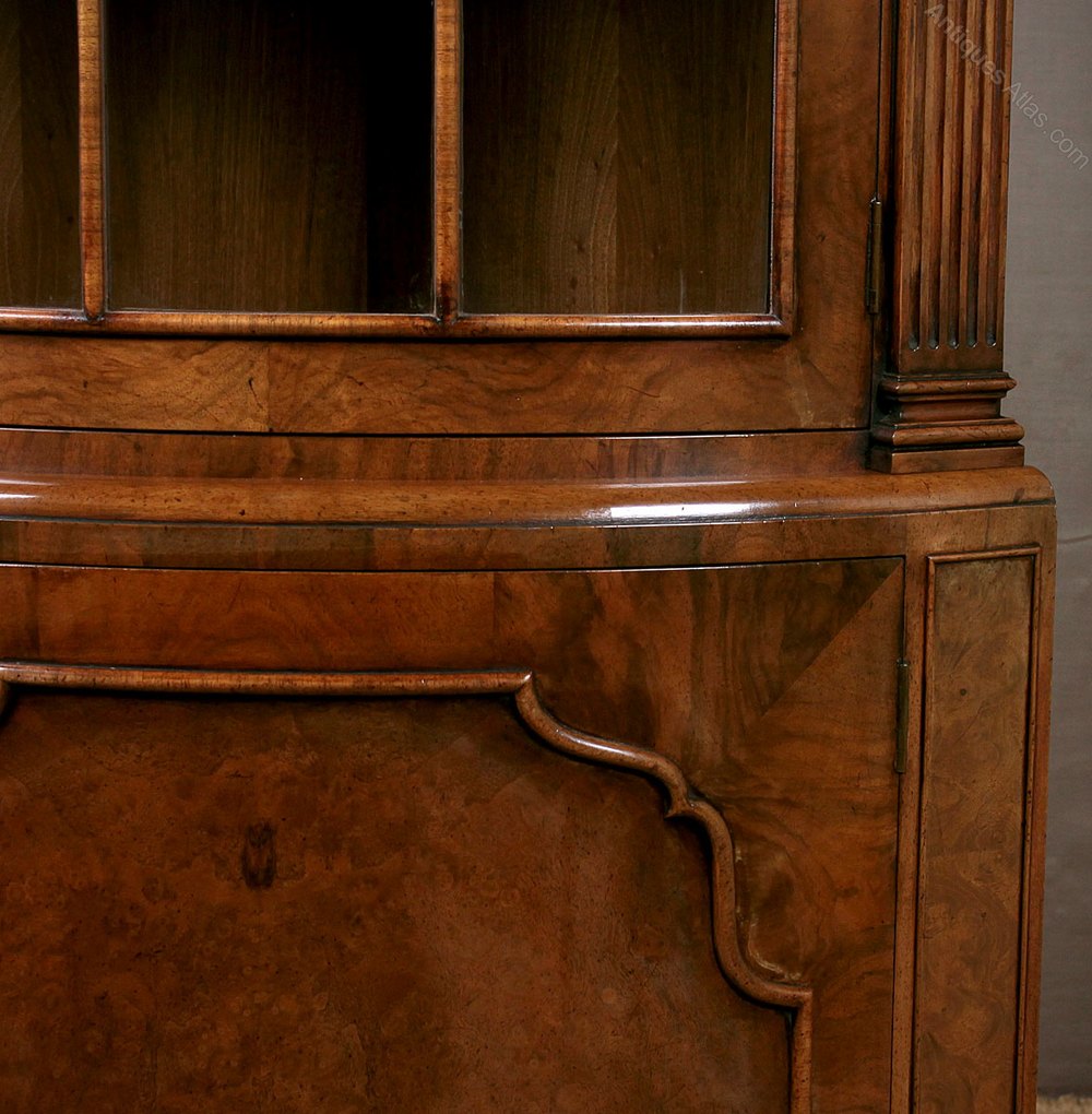 Very smart George II style corner cabinet in walnut by the quality British cabinet makers Titchmarsh & Goodwin. Great looking cabinet in two pieces with a glazed top fitted with two adjustable shelves, over a single door cupboard base. Bow fronted, with an arched cornice, fluted column sides and shaped glazing repeated in the shape of the door panel. Beautiful honey coloured crossbanded walnut veneers, shaped and raised mouldings and additional burr walnut panels. The interior is also finished in walnut. Excellent colour and condition with a maker’s label to the rear.