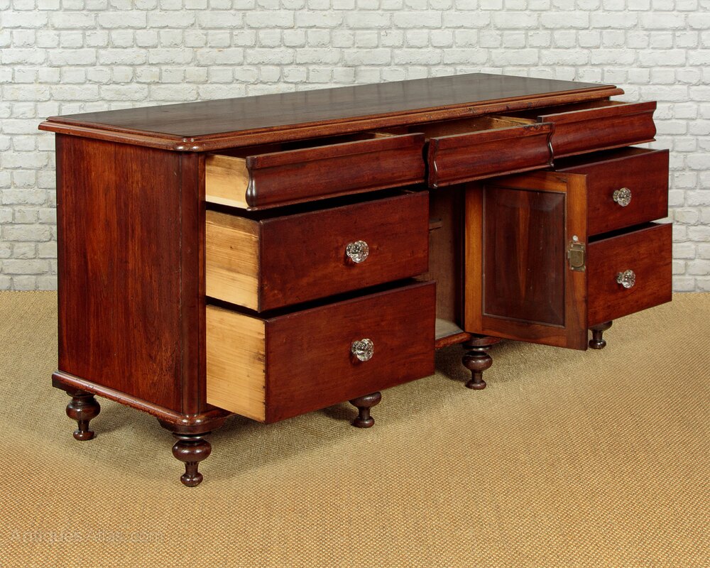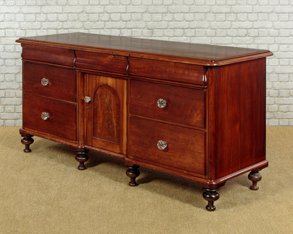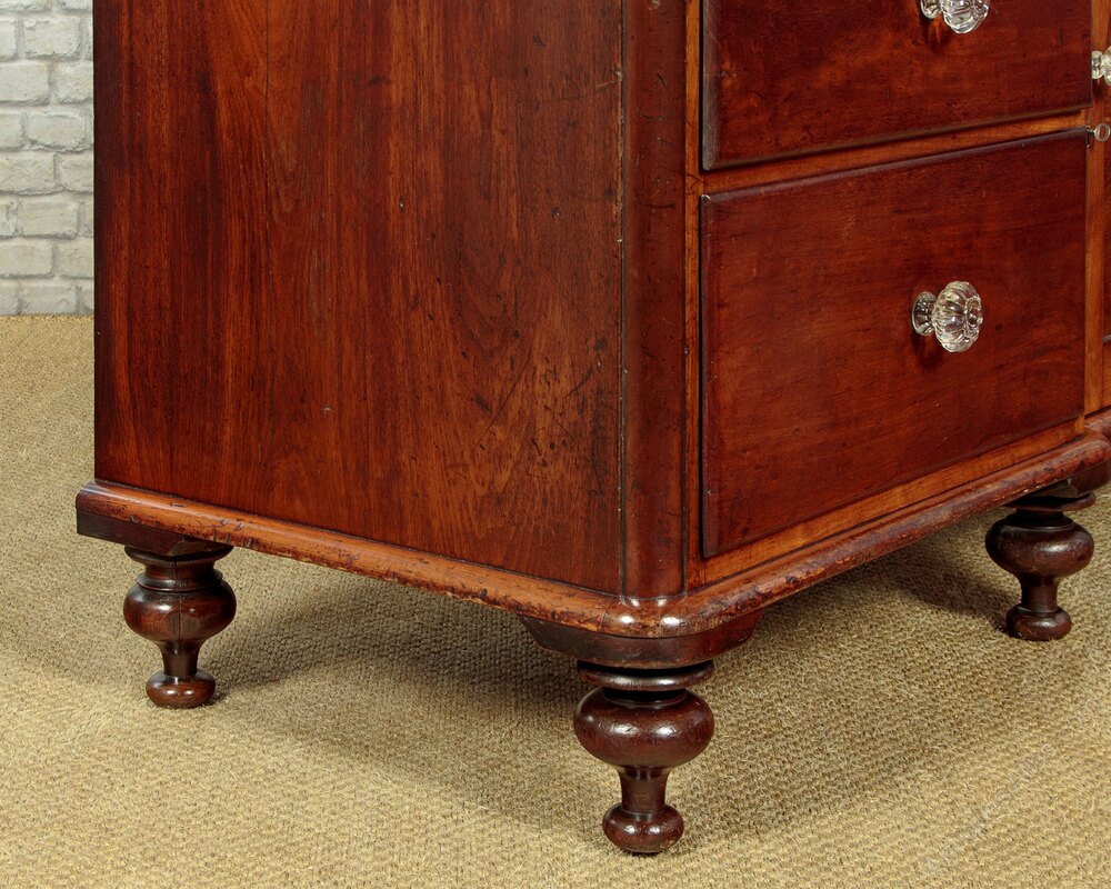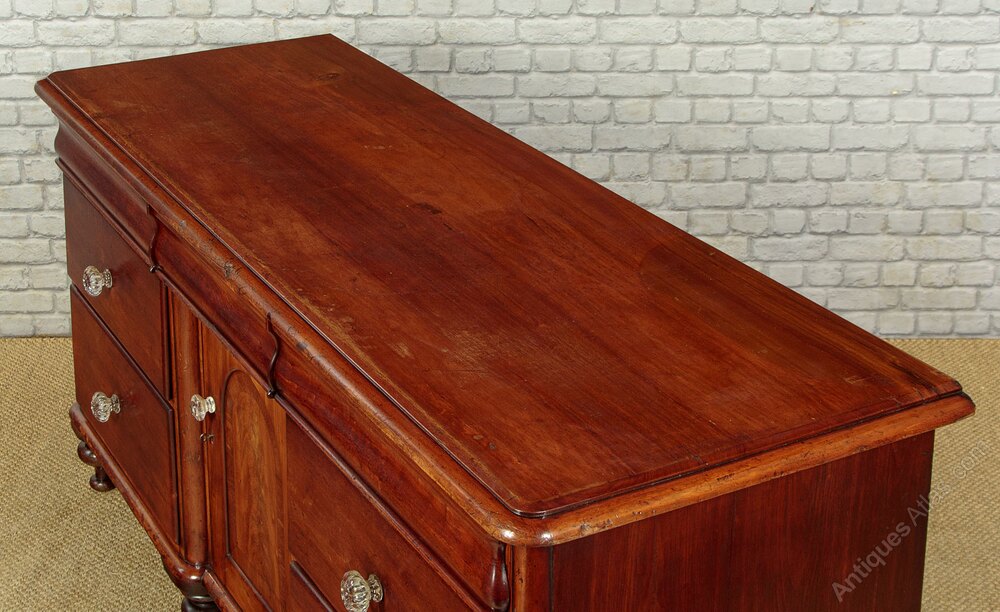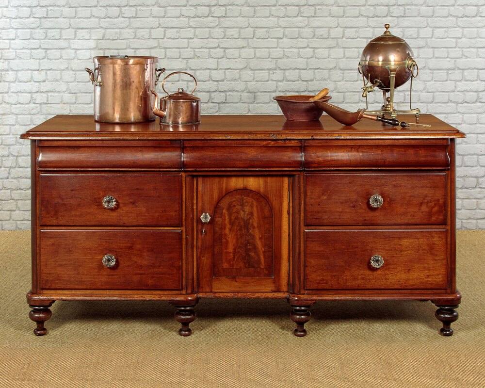 Mid 19th.c. kitchen dresser or sideboard in walnut c.1880. Solid walnut top with a deep applied thumb moulding to the front and sides. Over a row of three drawers across the top and a small central cupboard flanked with two large drawers of graduated height on both sides. Moulded drawer fronts to the upper drawers, an arched flame mahogany and crossbanded panel to the cupboard door and original glass knobs to the larger drawers. Solid walnut sides. Thumb moulded trip around the base and raised on the original turned feet. Note how the slightly recessed centre and the taller than normal feet allow the piece to be comfortably stood at as a kitchen worktop. Some wear to the top with a couple of obvious knocks to the moulding at the front centre. Otherwise very good colour and condition, cleaned and waxed in our workshops.