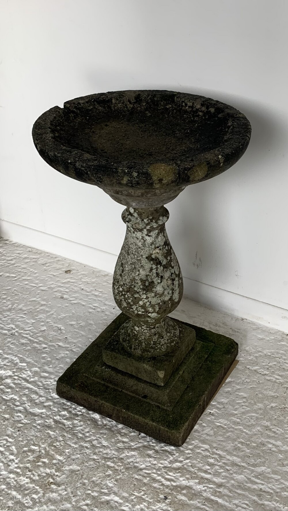 Dating early 20th century a substantial size quality reconstituted stone bird bath with substantial dish top on baluster column stood on a square base
