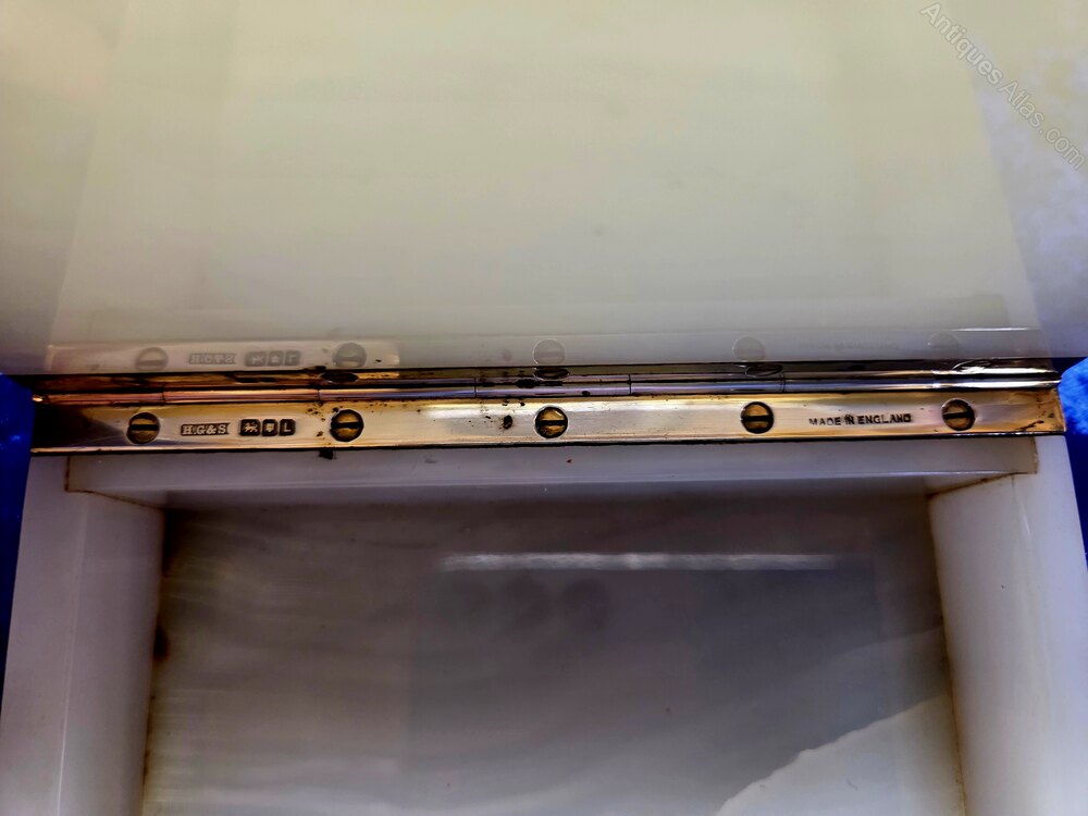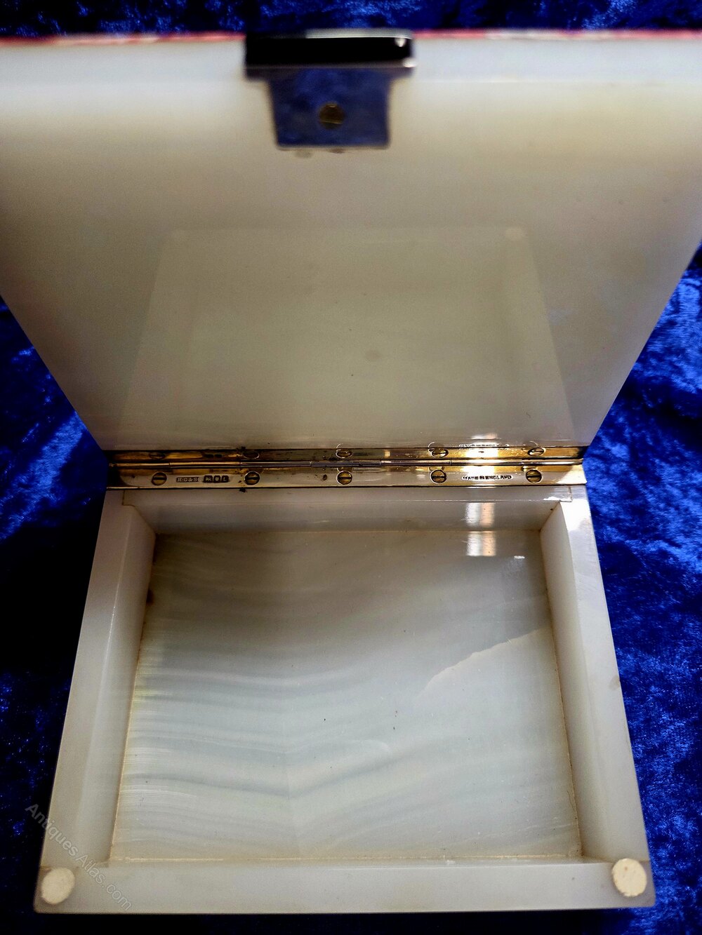 Henry Griffith & Son white onyx and pink marble box with silver fittings.Fully hallmarked London 1946.In very good condition,slight fracture in base,see photos.Measures 10.5cm x 9.5cm x 4cm.