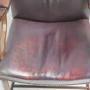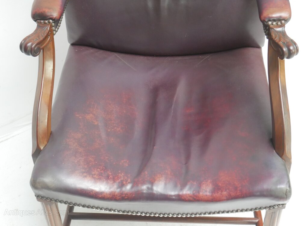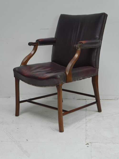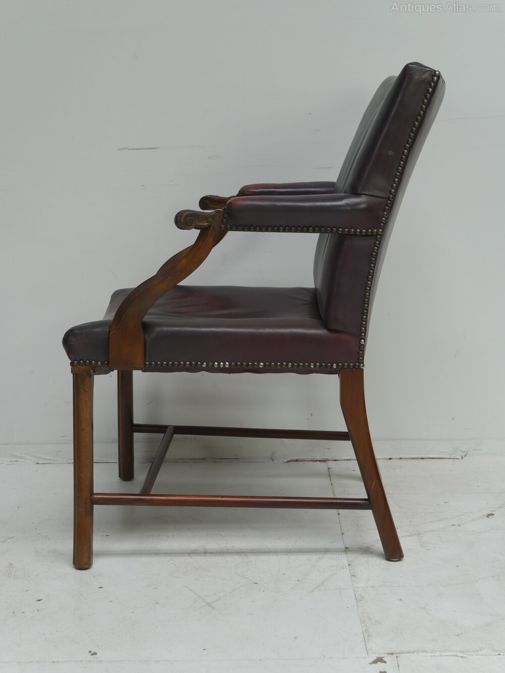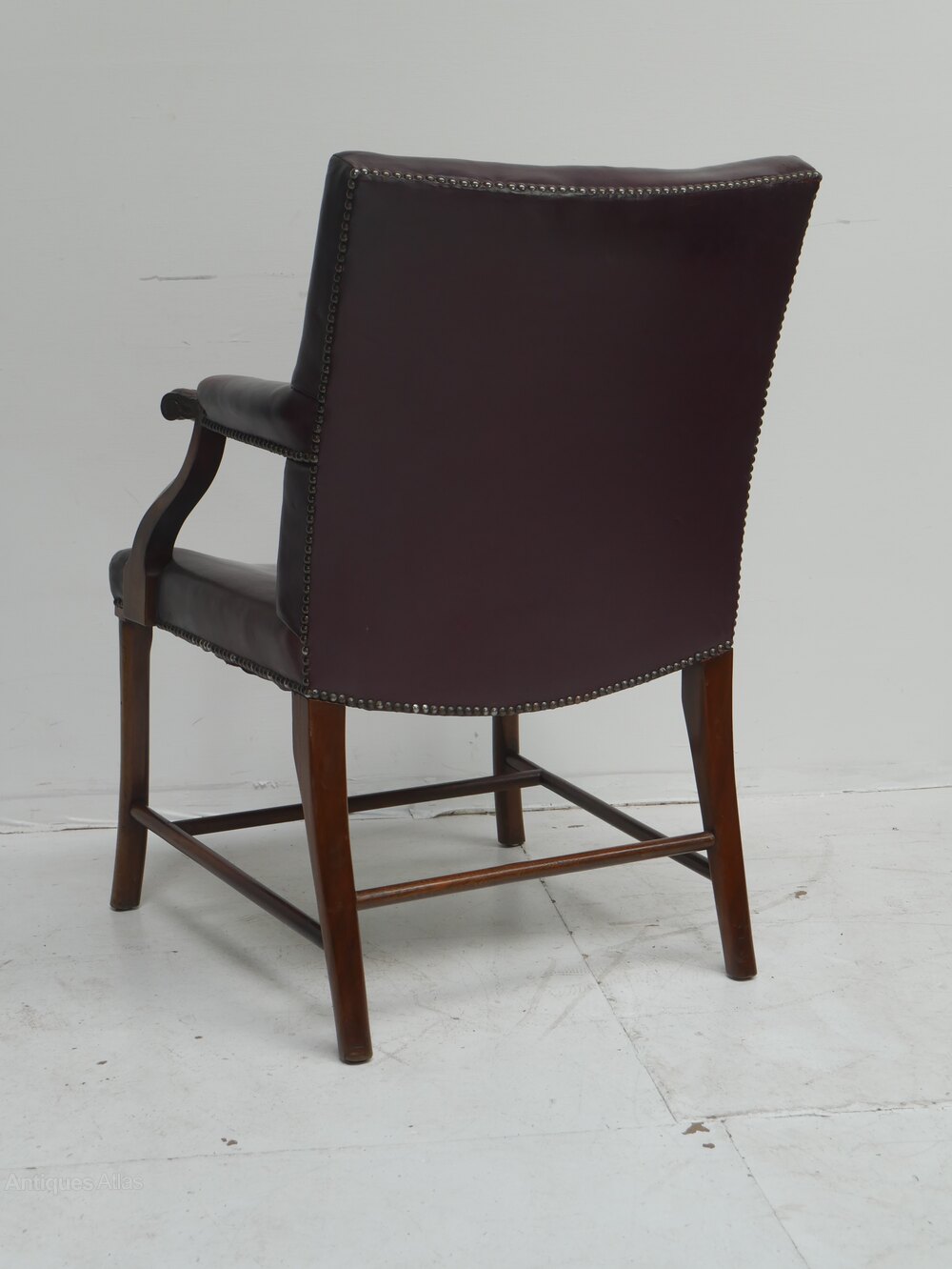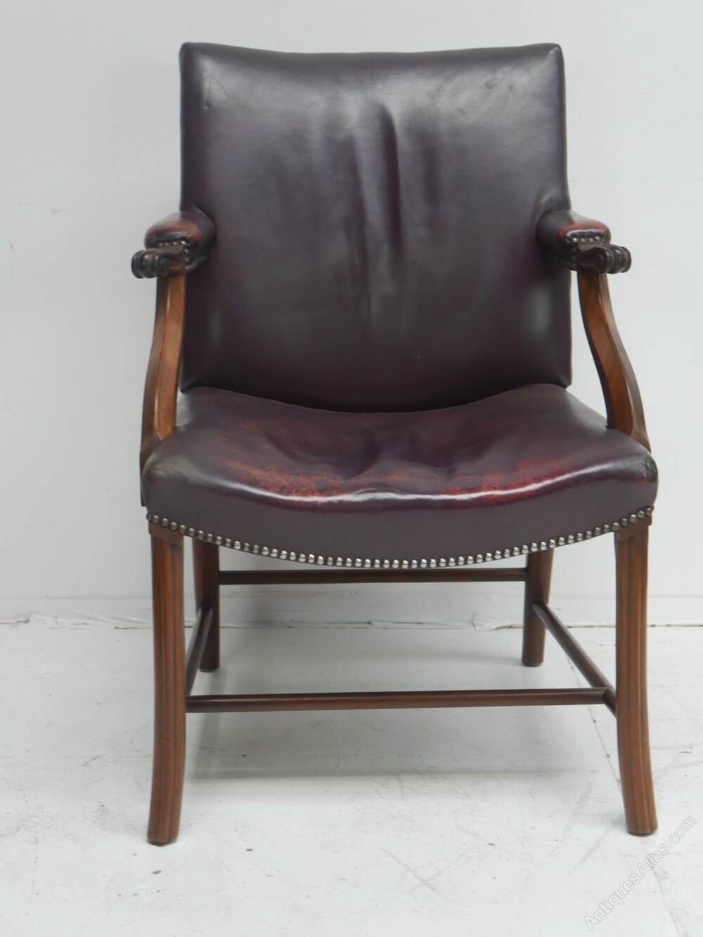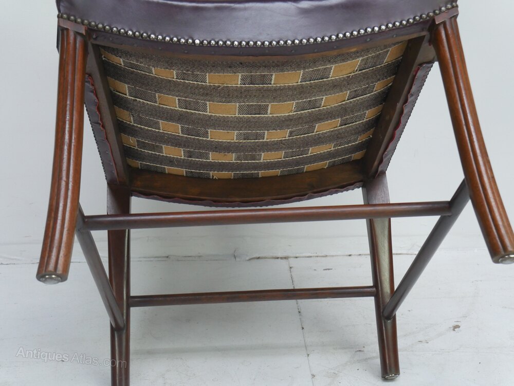 A well designed armchair upholstered in leather, a comfortable saddle seat with well shaped chamfered mahogany arms and leather arm pads, shaped reeded legs and supporting stretchers. The chair by Whytock & Reid the Edinburgh cabinet markers, all in good condition with a seating height of 47cm and all ready for use.