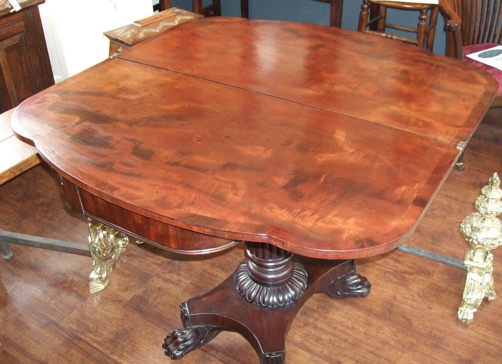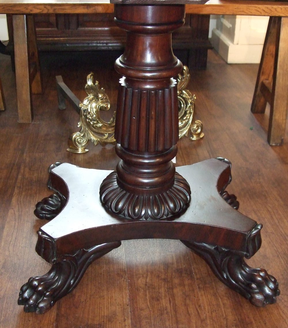 William IV mahogany tea table on fluted pedestal base, raised on four lion's paw feet.