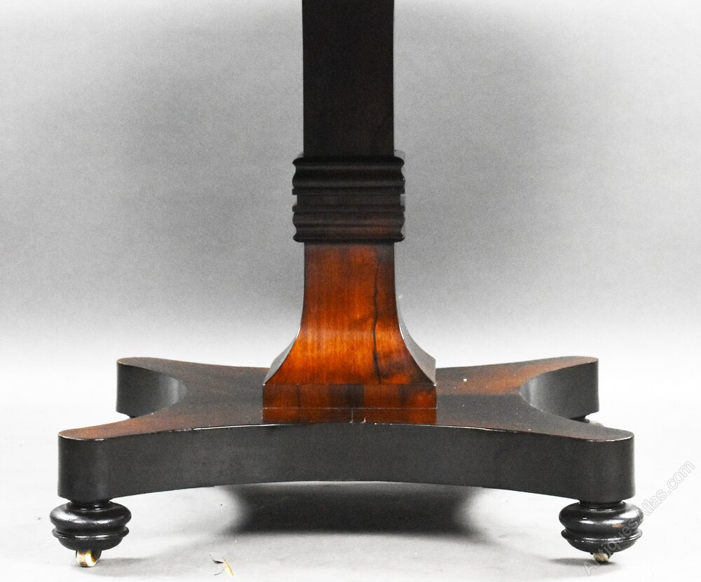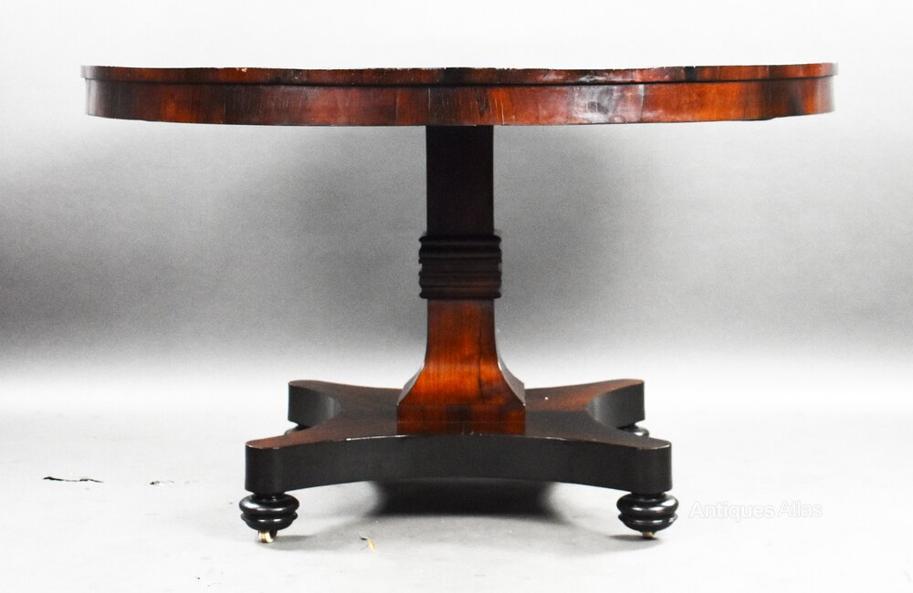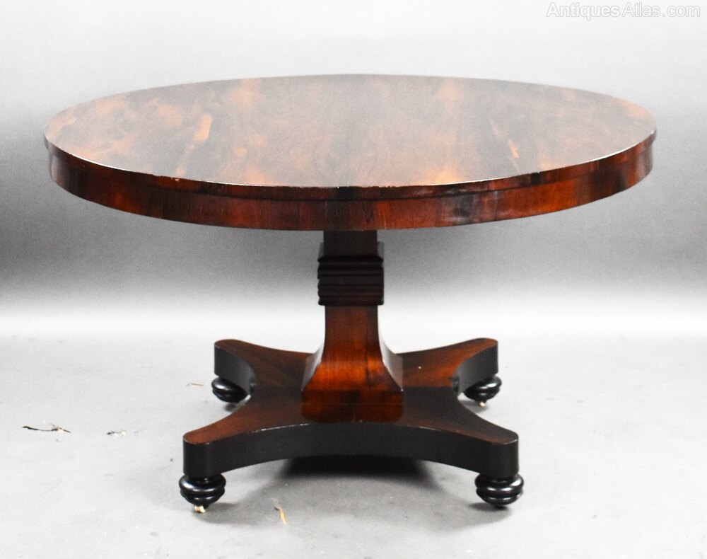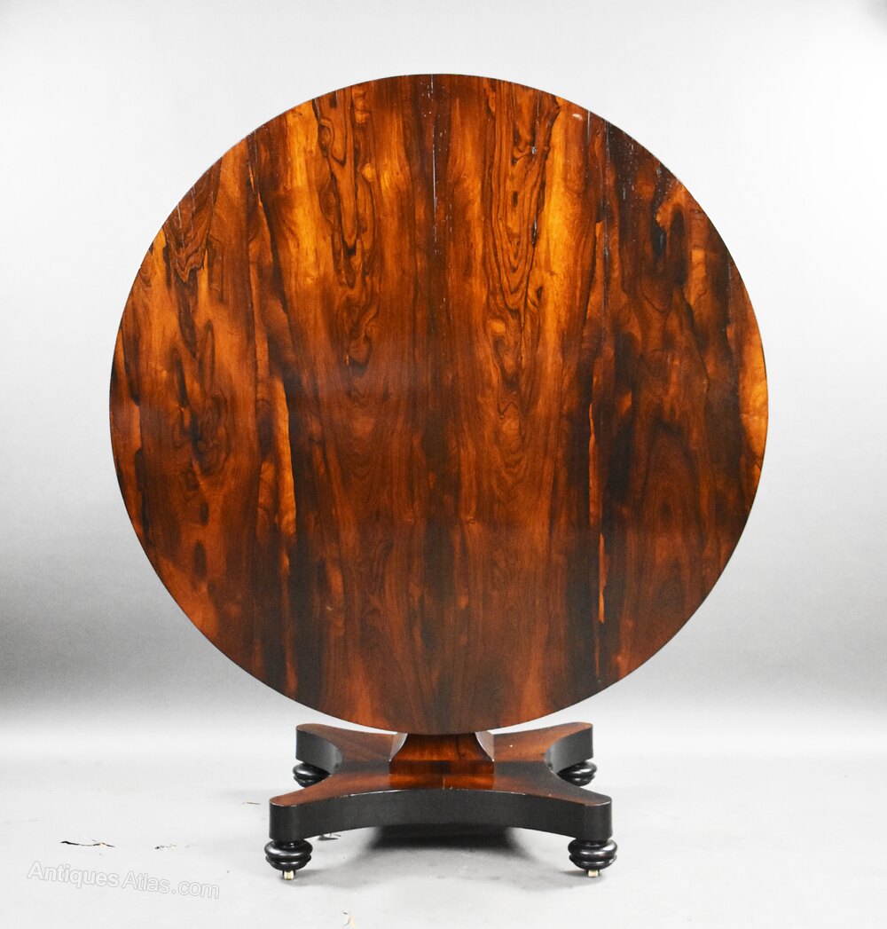 An elegant William IV period circular breakfast table, superbly constructed from beautifully figured rosewood. The tilting top displays a striking, richly grained surface, resting upon a bold faceted column and a well-proportioned quadriform base terminating in compressed bun feet with concealed brass castors. This fine example of early 19th-century design exudes both grandeur and practicality, offering a timeless centrepiece for any refined interior.