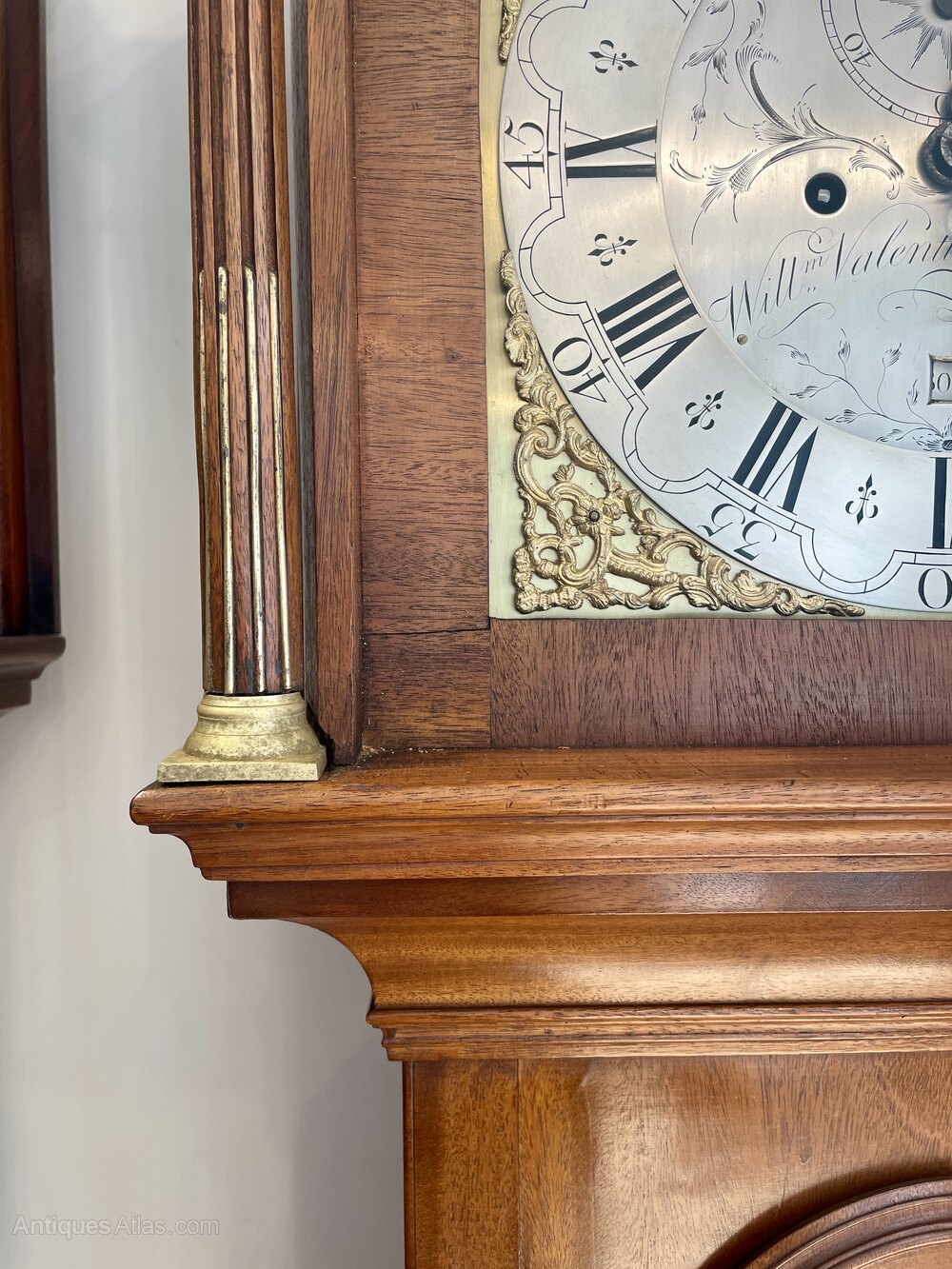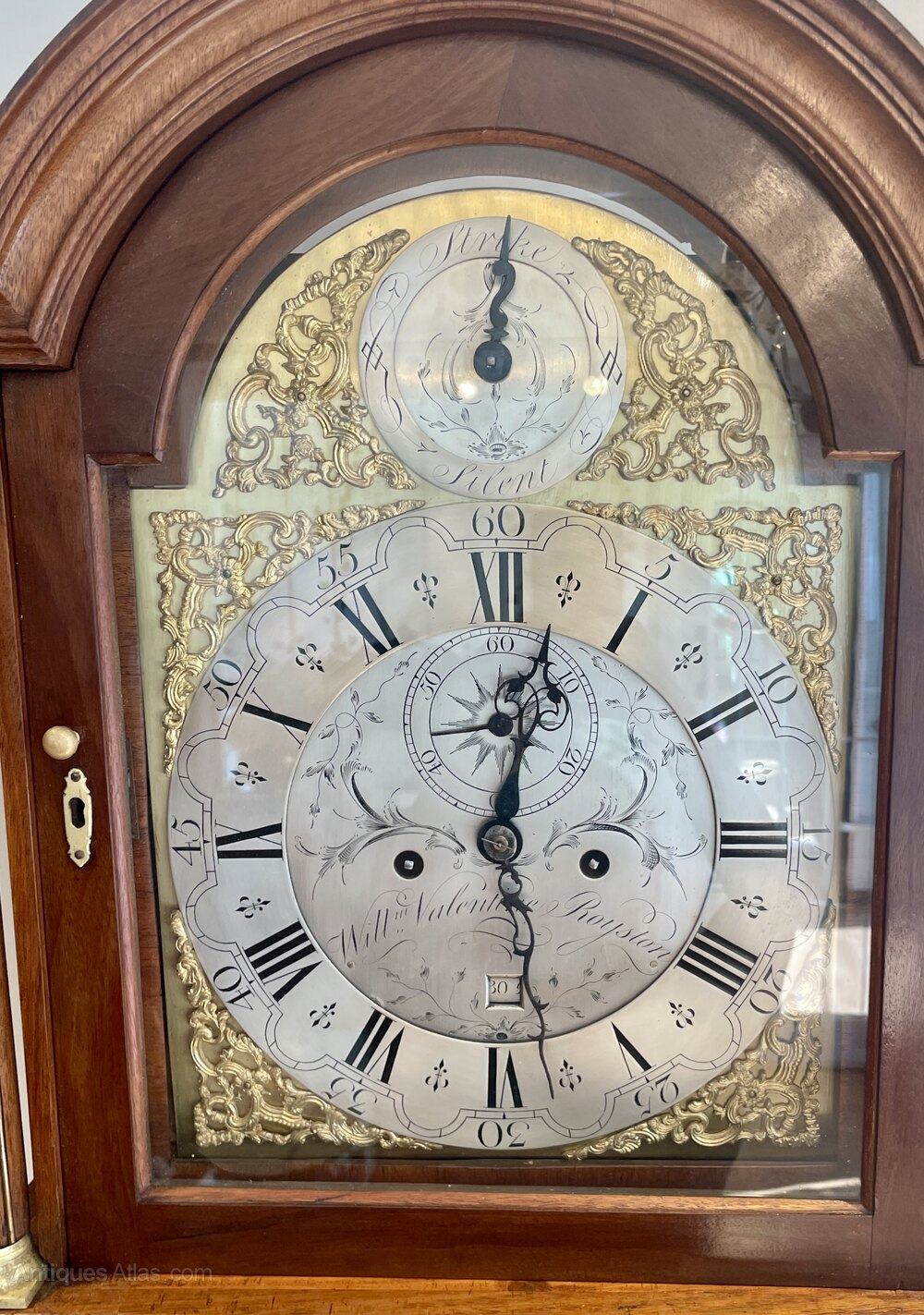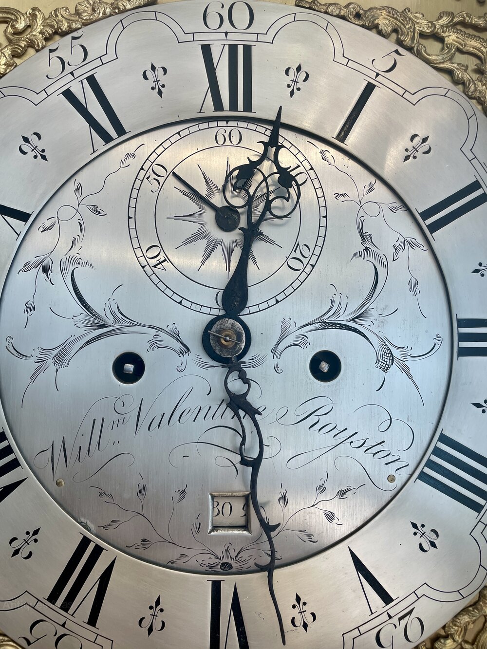 An 18th Century longcase clock, the 30cm arched silvered dial marked Valentine Royston, having silent dial, minute dial and calendar