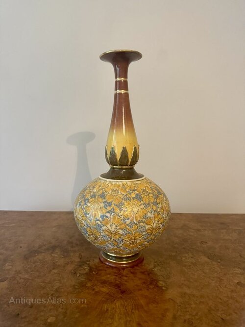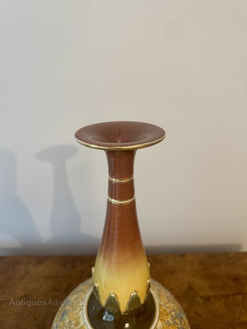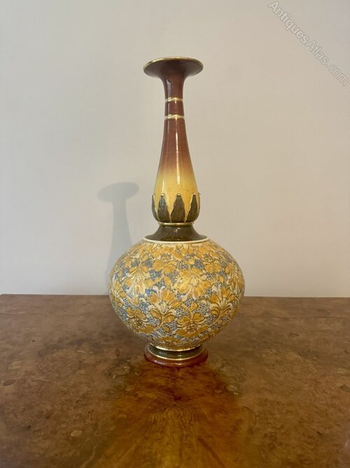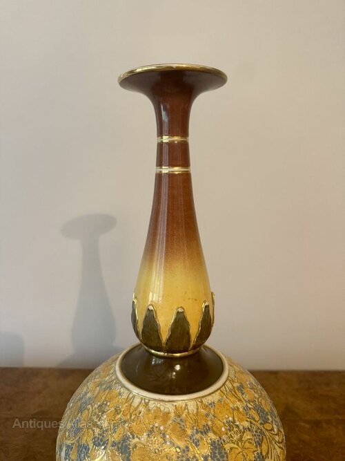 Wonderful quality large antique Doulton vase, having a bulbous lower body decorated with raised floral detailing in gold and blue colours on a golden ground below a slender long neck with fading colours from golden yellow to deep red accented with a gold trim around the flared rim.