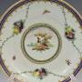 A very striking Worcester porcelain saucer dish decorated in the Earl Dalhousie style. A blue bordered edge with gilt dentil rim, and over gilded with a chain effect border and stylised arabesque inner edge. Gathered groups of fruit strawberries, apples, grapes and plums are suspended from delicate floral garlands strung from the outer border. The central reserve, framed with a black and turquoise enamel husk border and gilding, contains a colourful "fancy bird" set in an exotic landscape. Butterflies and a ladybird are scattered between the fruit festoons. Unmarked, c.1780.
