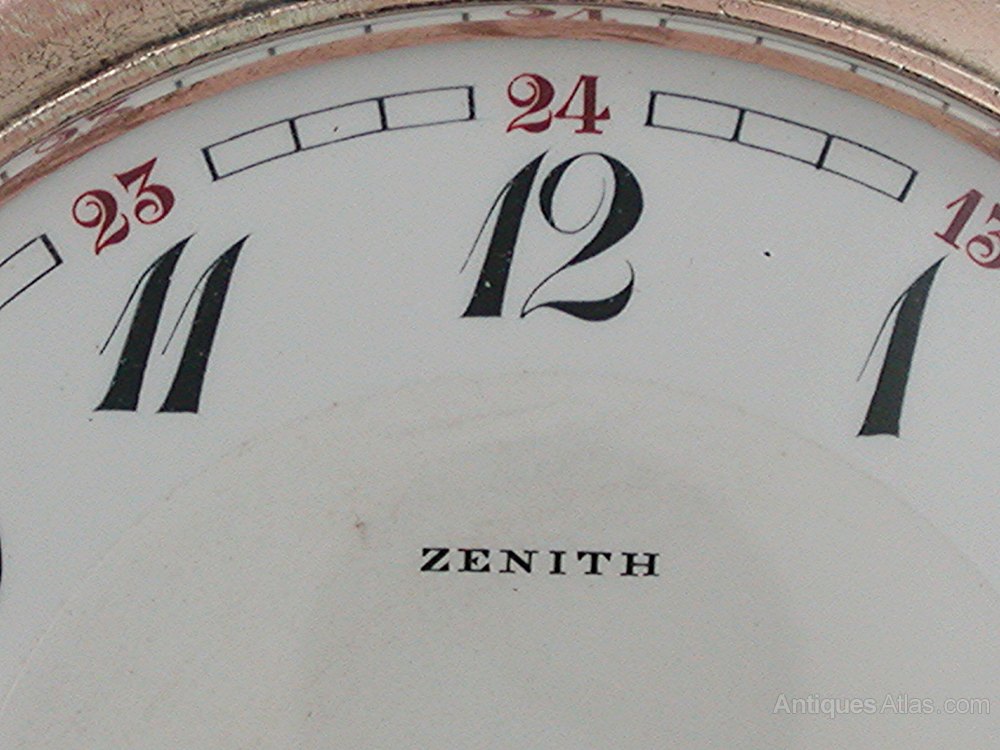 Dial: The white enamel dial has black Arabic numerals with outer minute divisions and outer red 13-24 hour numbers, golden antique style hands and a subsidiary seconds dial at the six. The dial is signed in the upper centre: “Zenith”.