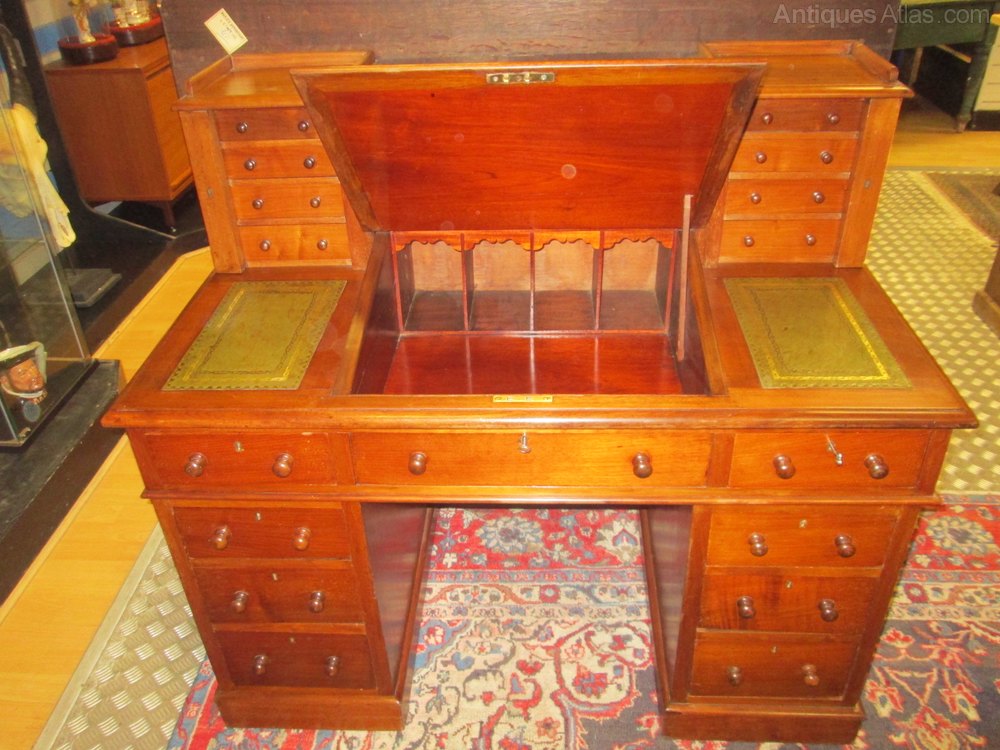 Good quality Victorian mahogany dickens desk with green leather top , 8 drawer gallery top and a further 8 larger drawers in the pedestals , lots of storage under the slope top and perfect for use with a laptop computer or for writing.in good order