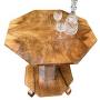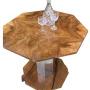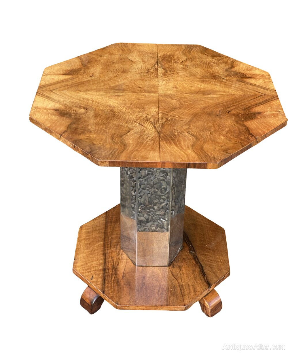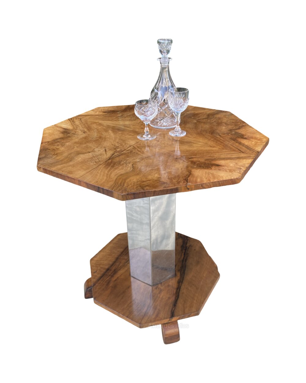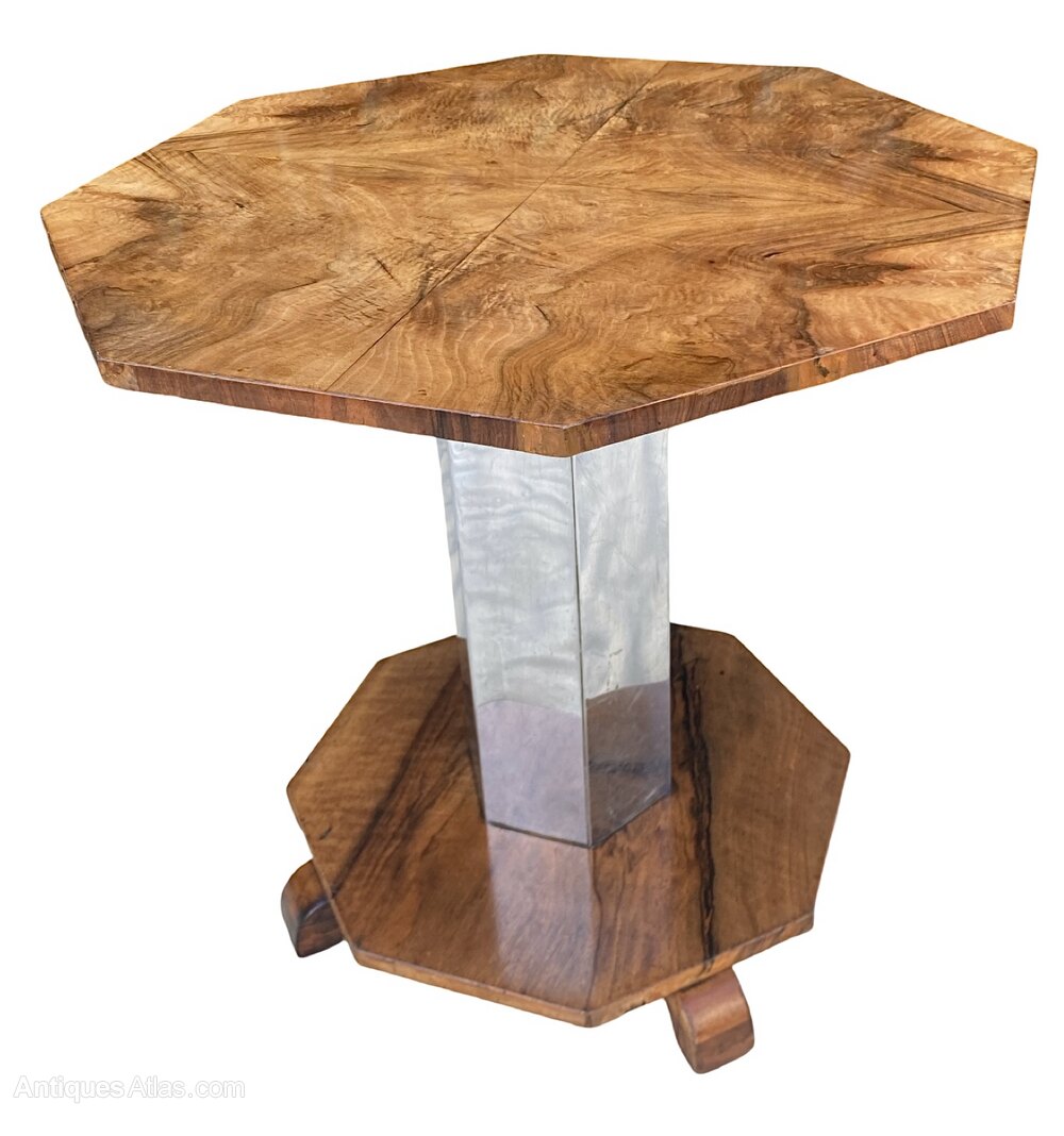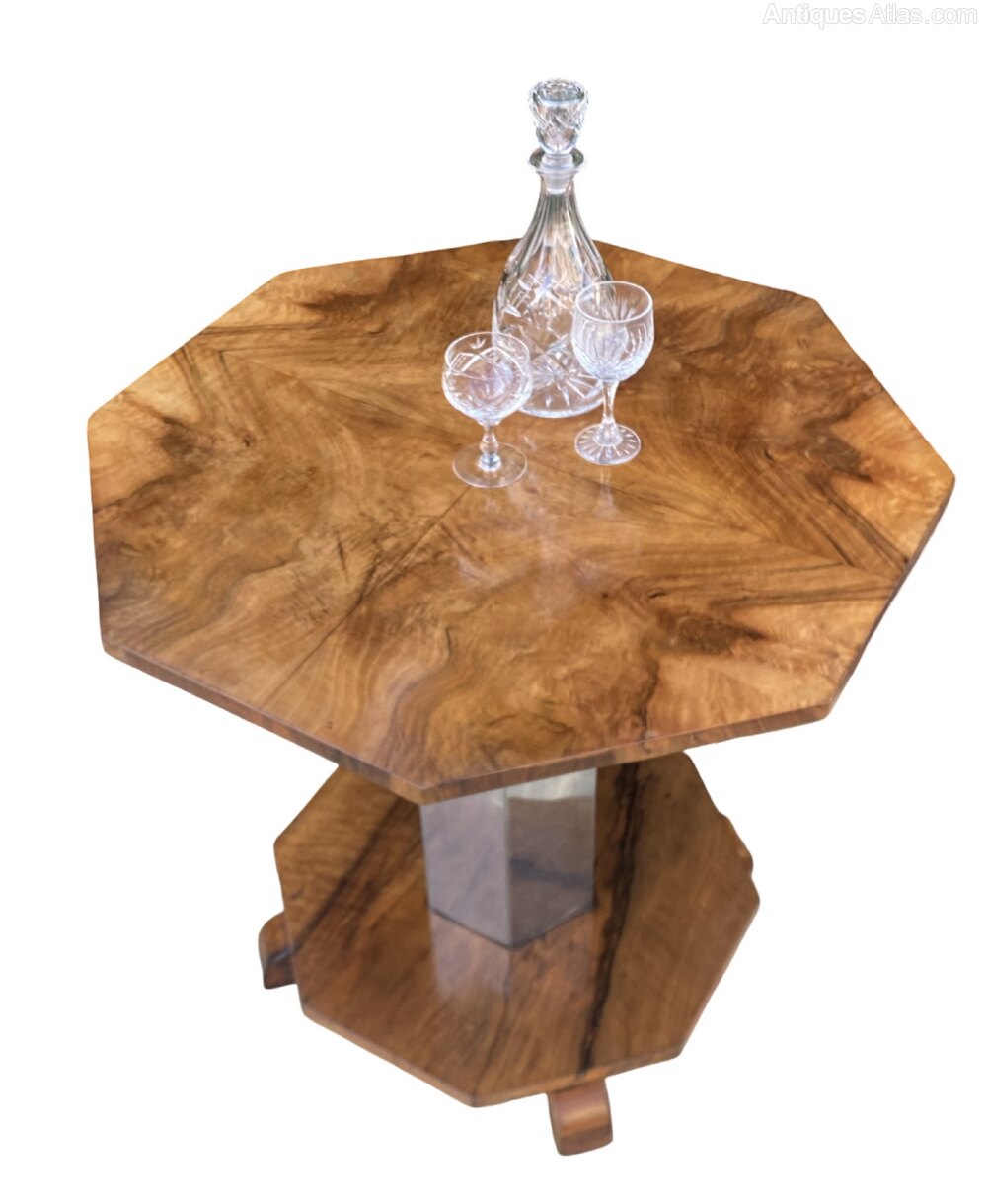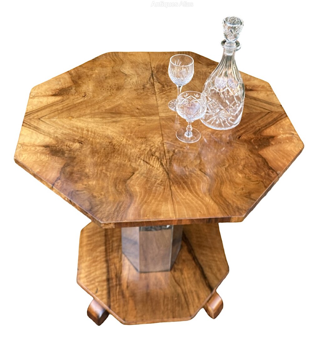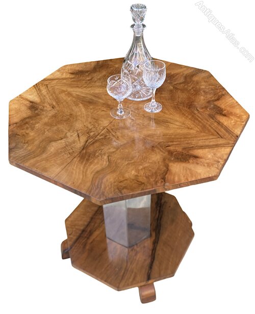 A gorgeous and rare Art Deco Coffee Table in lovely mellow figured walnut. The octagonal top is bookpaged and quarter veneered and is in excellent condition and is raised on an octagonal chrome stem raised on smaller octangular figured walnut base with 4 sturdy supports in 2 tone walnut.The chrome and walnut contrast each other perfectly and make for a striking centre piece.