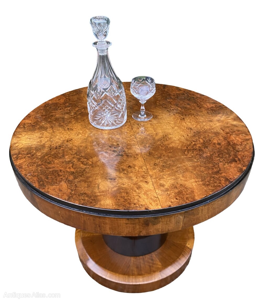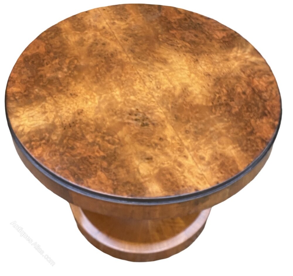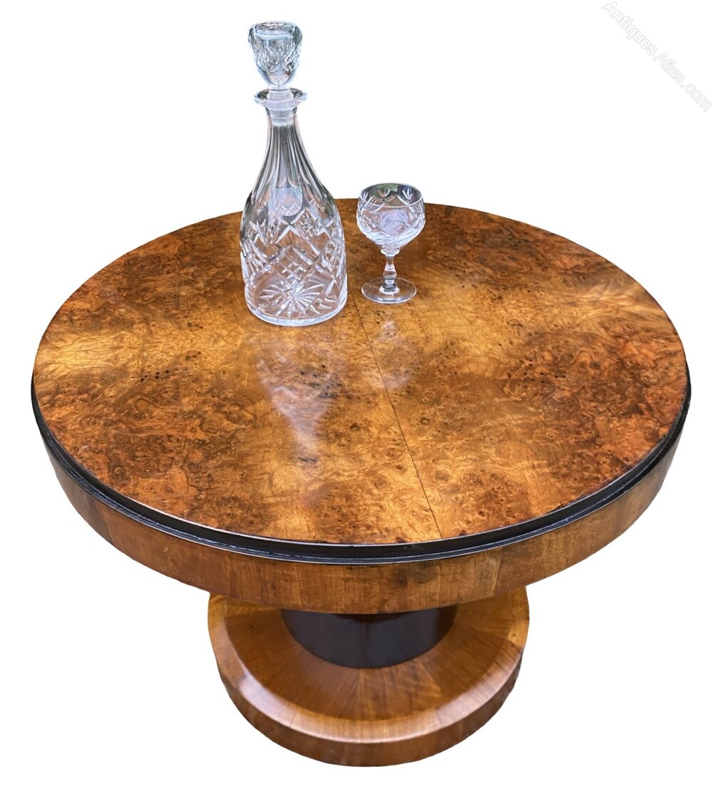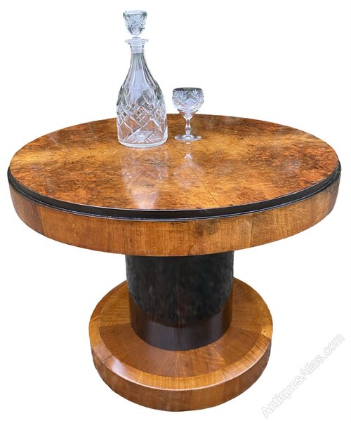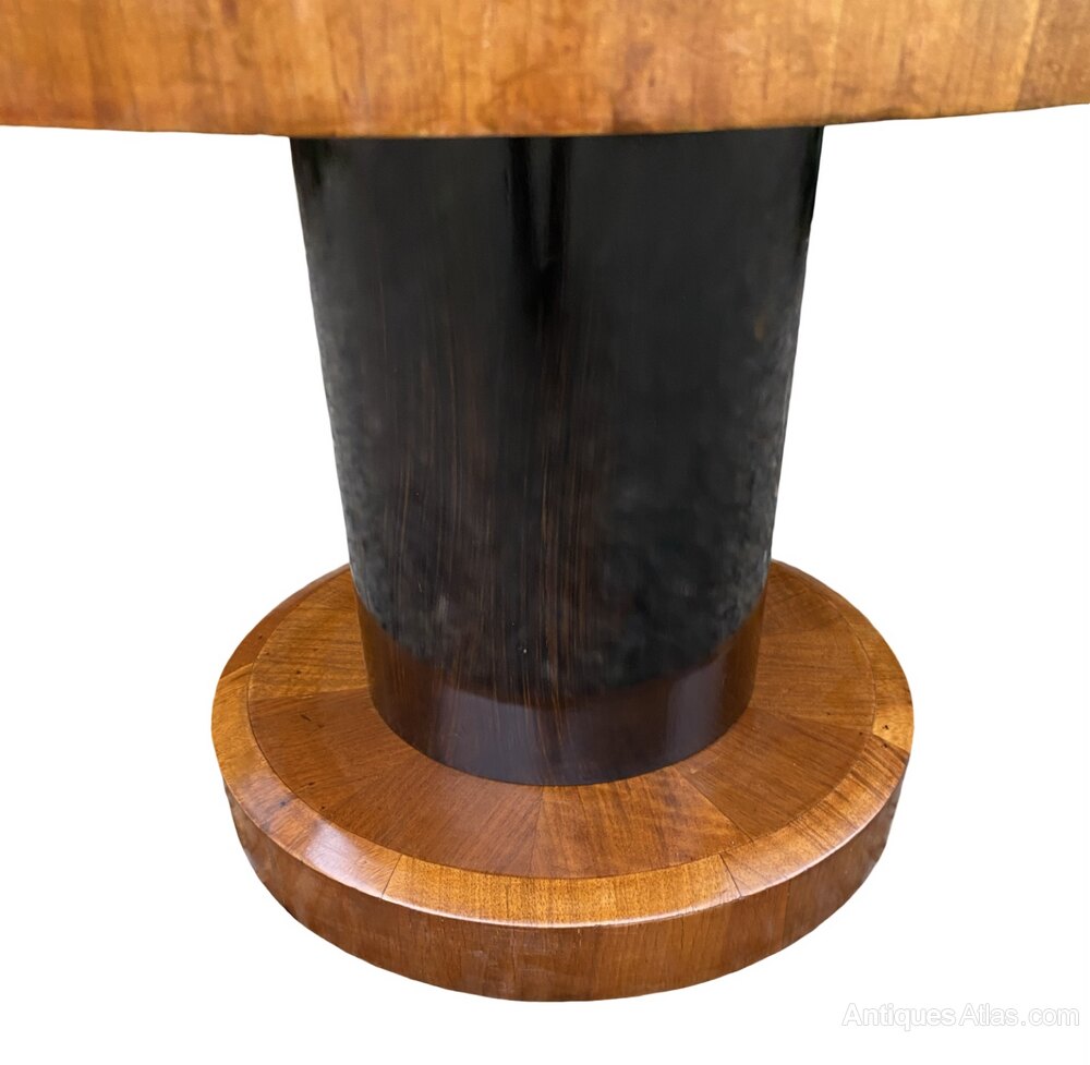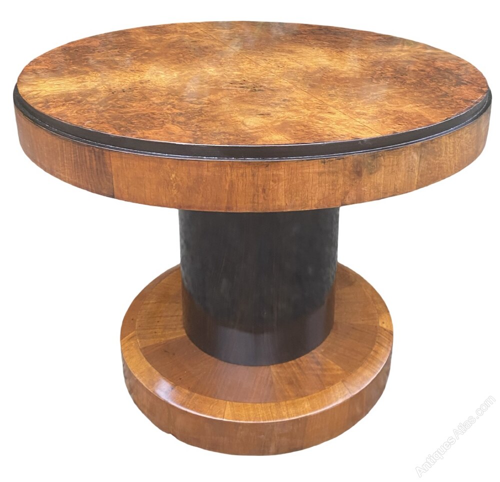 A gorgeous Art Deco Coffee Table dating to Circa 1930. The top is highly figured walnut and a lovely rich conker colour with ebonised surround. . The stem is faux maccassar which adds a dramatic feature to this already attractive table. Raised on a circular figured walnut base, this table certainly won’t dissappoint.Having passed through our in-house workshops it comes to you in excellent condition.