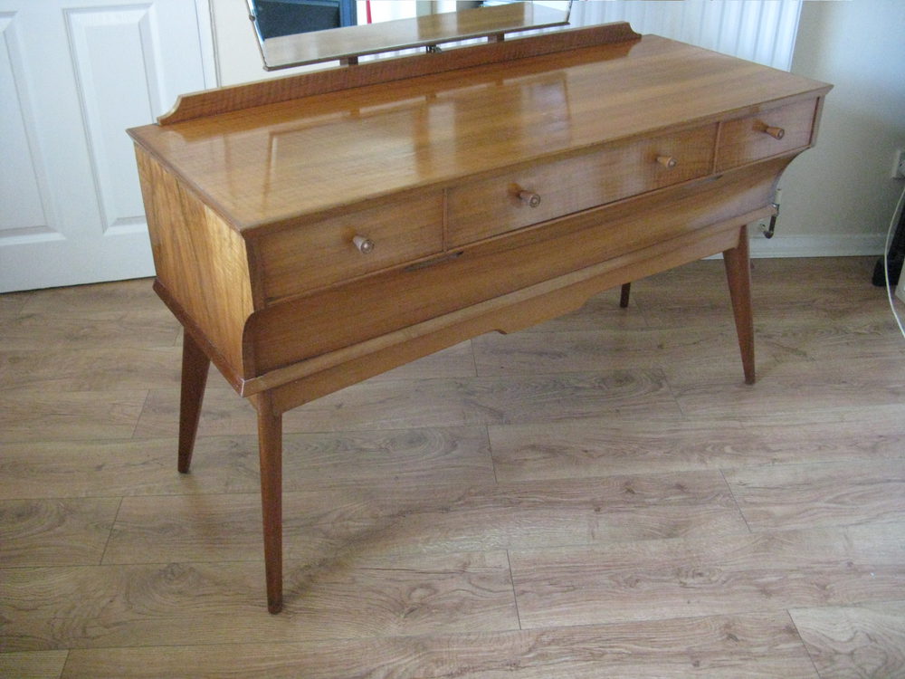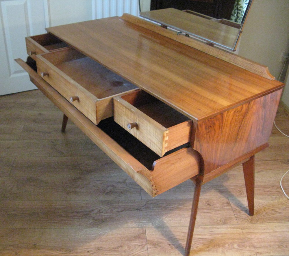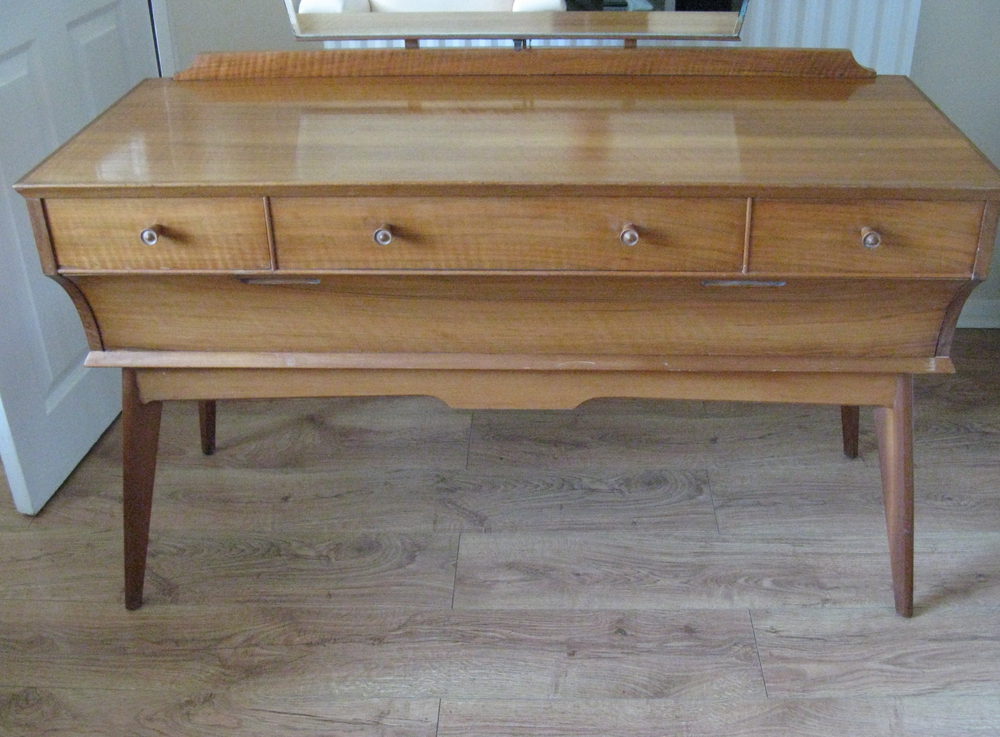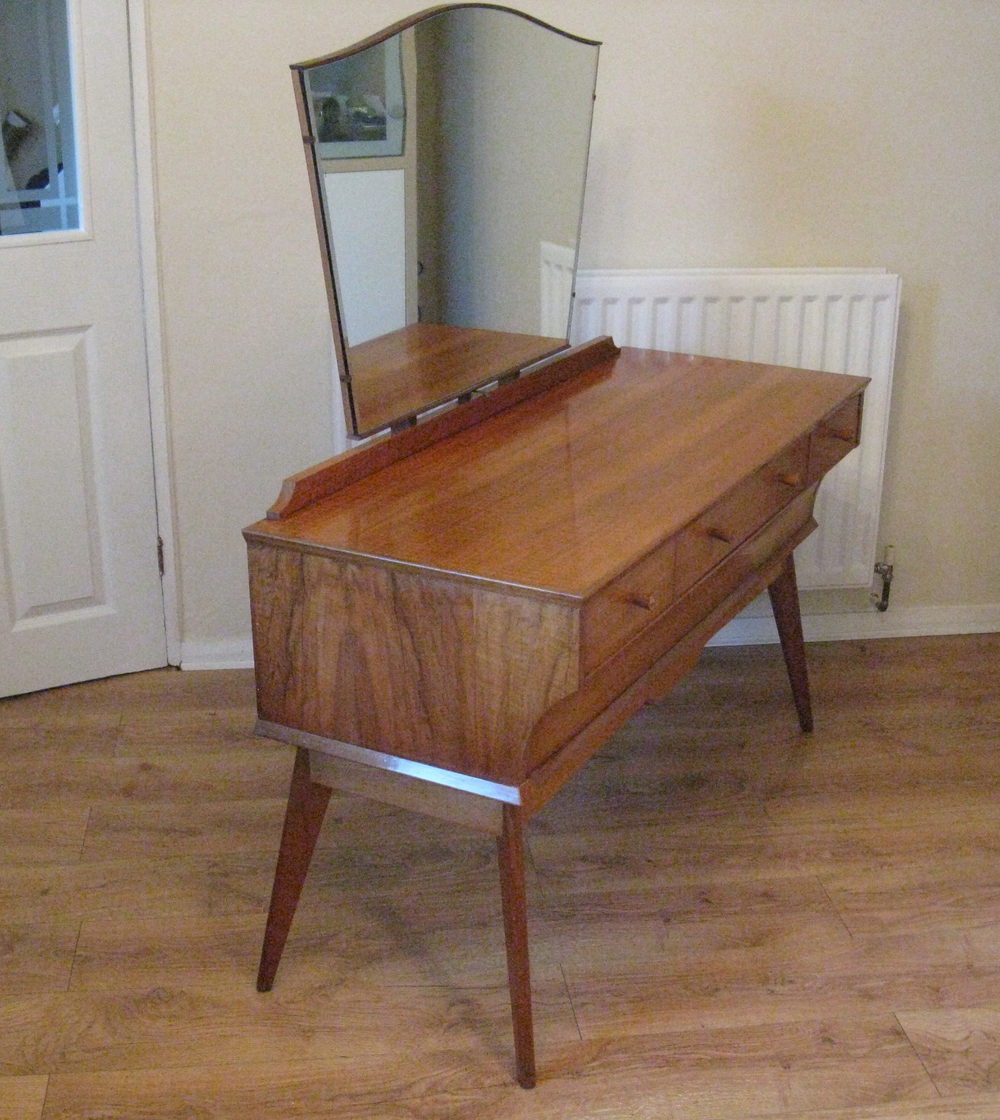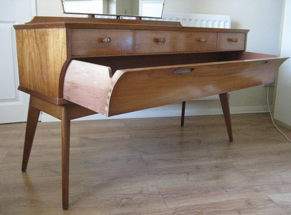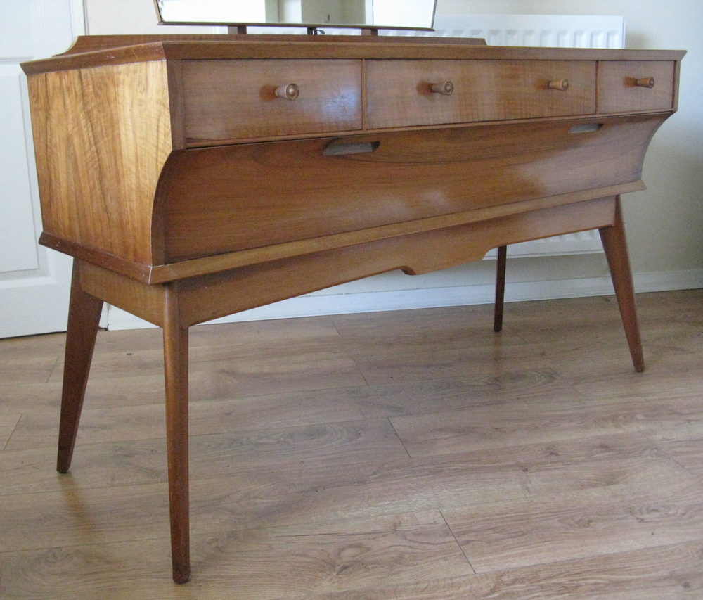 Heals Dressing Table by Alfred Cox ( this dressing table has now sold but please see our for sale items for another one we have for sale at the moment) as retailed in the 1950s by Heals and is in lovely light amber coloured satin walnut veneers.The dressing table has a flared shield shape mirror with 3 vanity drawers with original handles and a lovely concealed flared swept full length shaped bottom drawer all the drawers with dovetailed joints the dressing table is on tall typical 1950s flared shaped legs.A iconic piece of vintage 1950s modernist designer furniture dating to the festival of Britain era. Alfred cox was a maker designer of high quality handmade furniture his quality furniture was highly thought of and was retailed through Heals London department store. This modernist vintage retro dressing table is part of a Alfred cox bedroom suite we have in stock at the moment the other pieces of this bedroom suite,consisting of the matching satin walnut wardrobe and tall chest of drawers can be bought as a complete suite of vintage bedroom furniture or as single pieces.All the pieces have the makers name and reg design plates.Alfred cox furniture was made to a high quality the bedroom suite is in very good vintage condition and is ideal for a devotee of vintage fashion or 1950s modernist design period interiors.