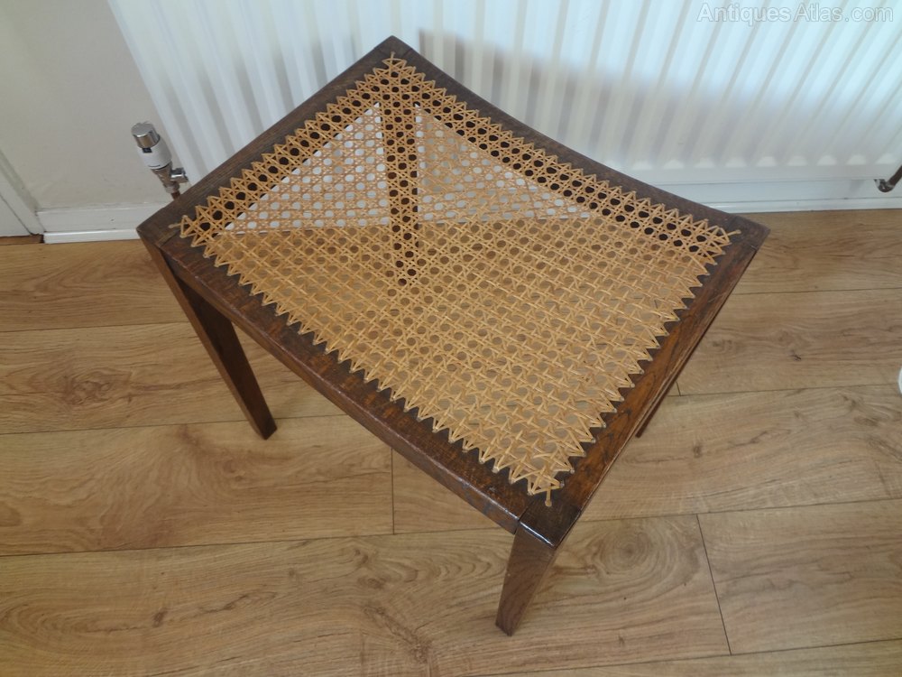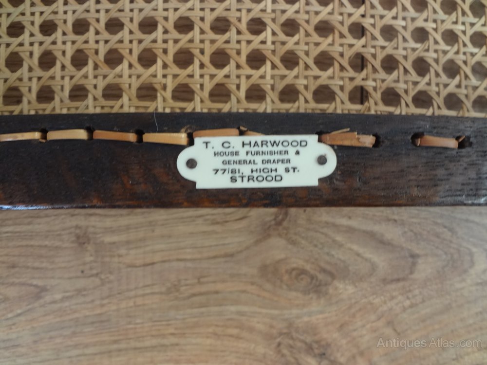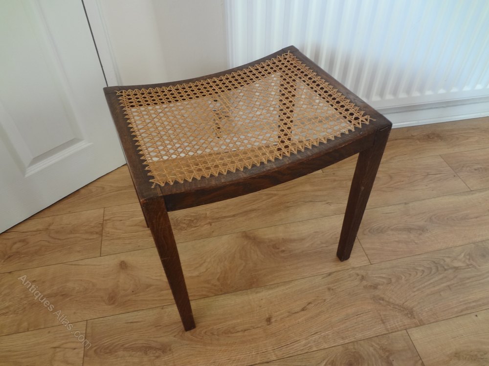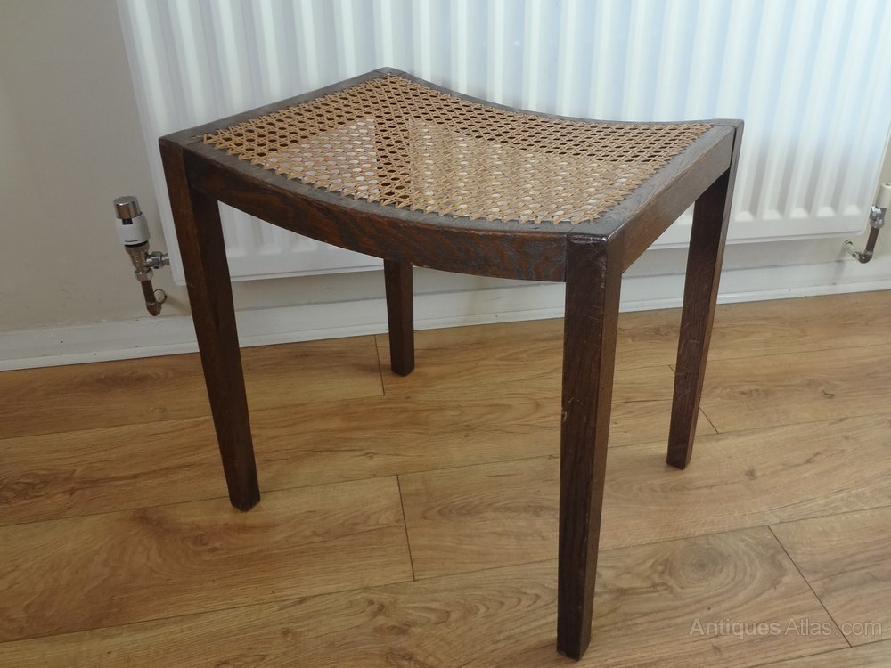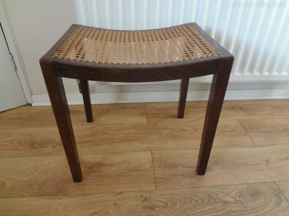 English oak bergere cane stool having new woven cane work to the curved shaped seat nice vintage stool with original retailers / makers plate for T.C. Harwood of StroodStyle Art deco