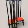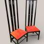 A striking pair of high‑back chairs inspired by the iconic designs of Charles Rennie Mackintosh, blending sculptural form with unmistakable Arts & Crafts elegance. These chairs command attention with their tall, architectural silhouettes, pierced geometric motifs, and rich black lacquered finish. The vivid red upholstered seats add a bold, modern contrast, enhancing their presence in any room.Key Features