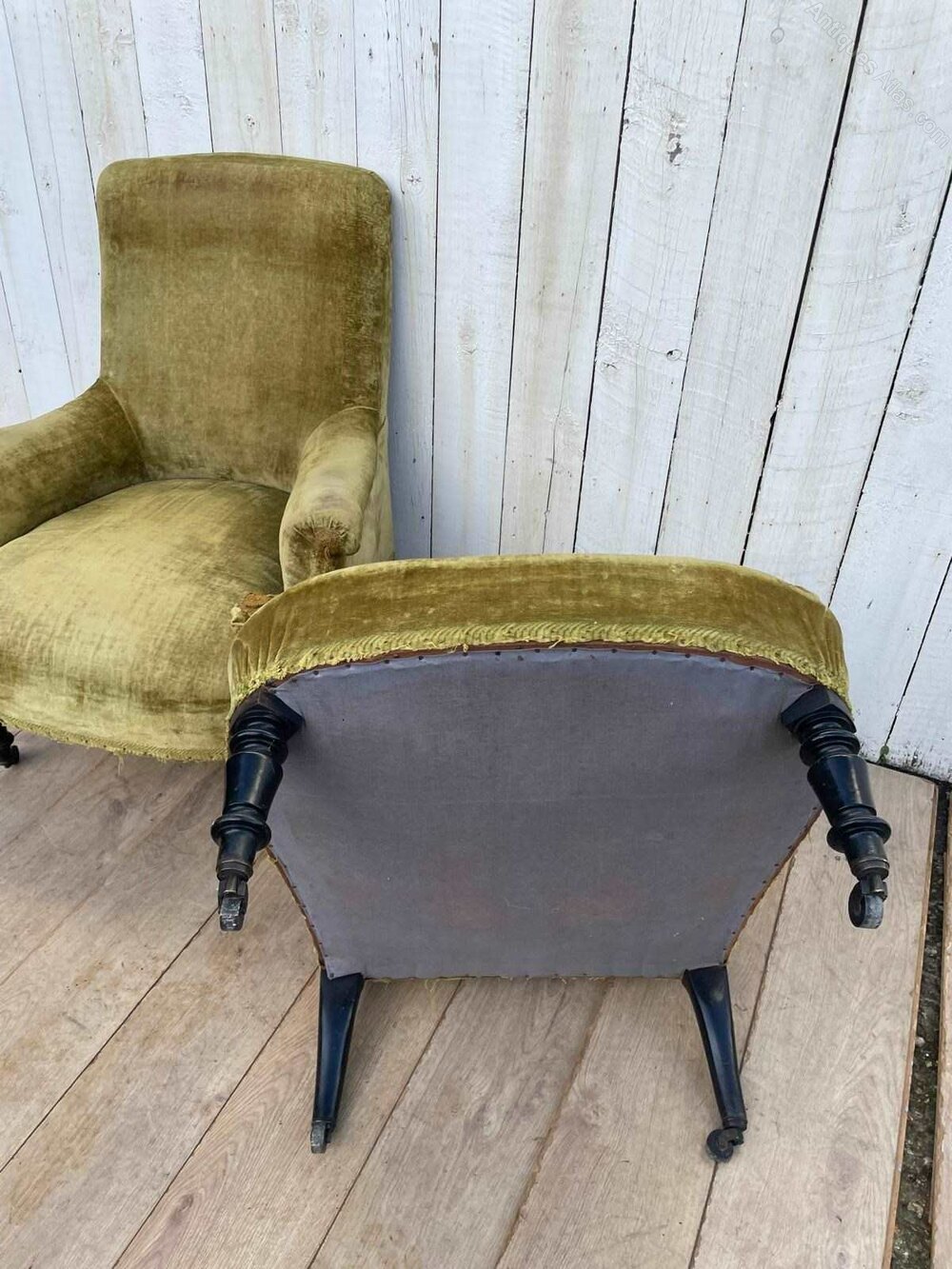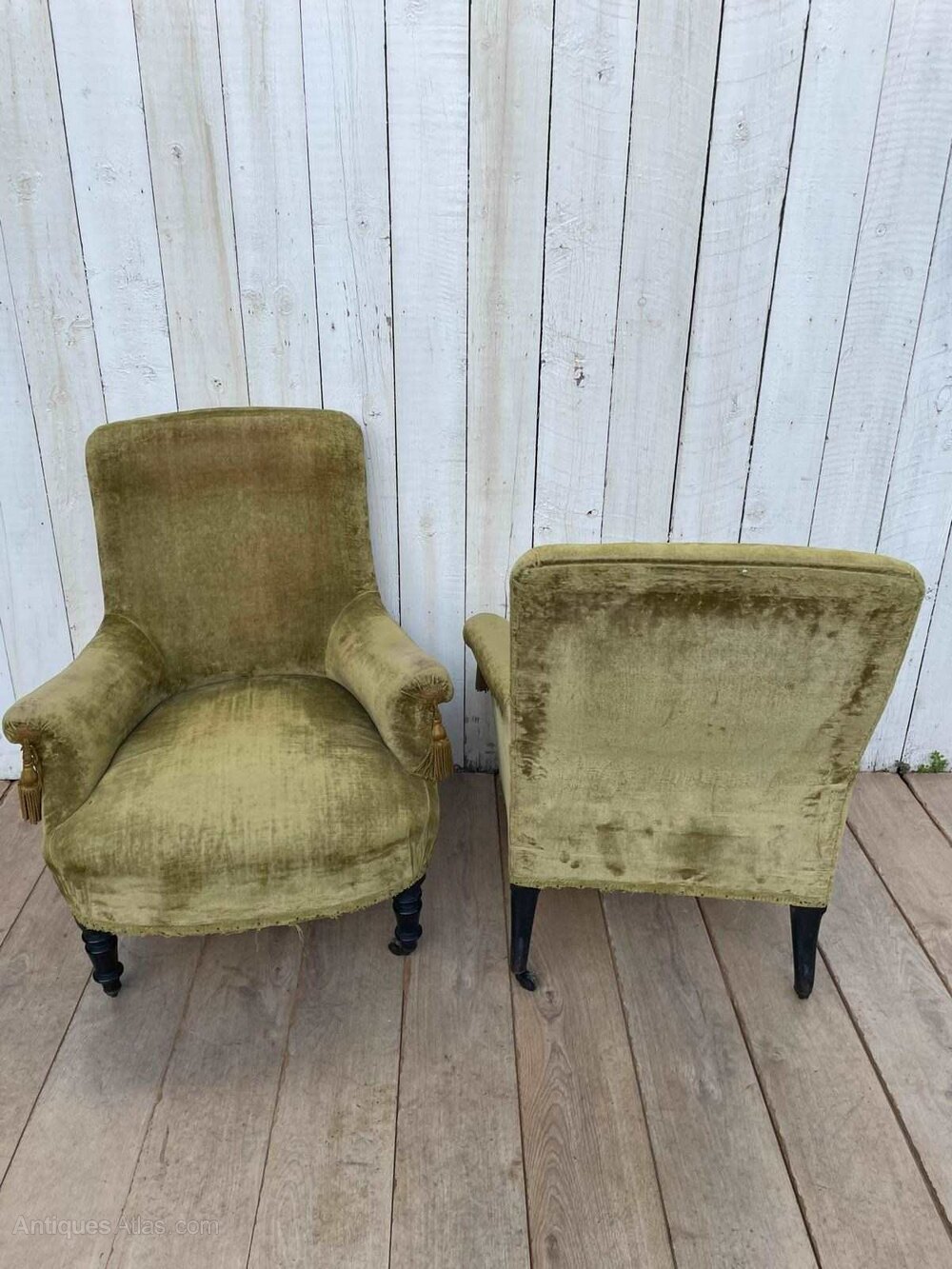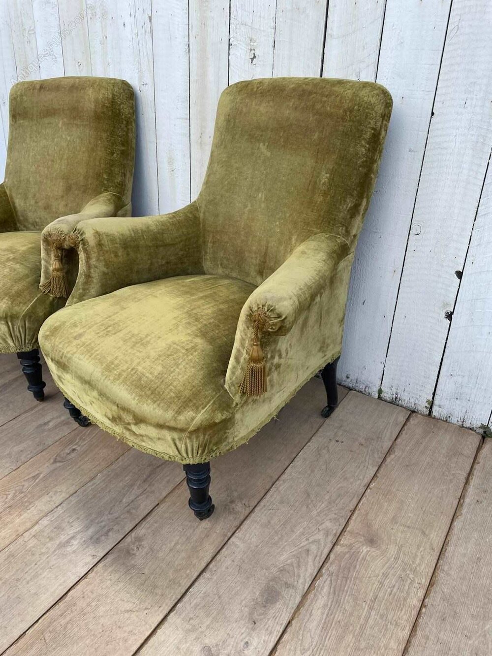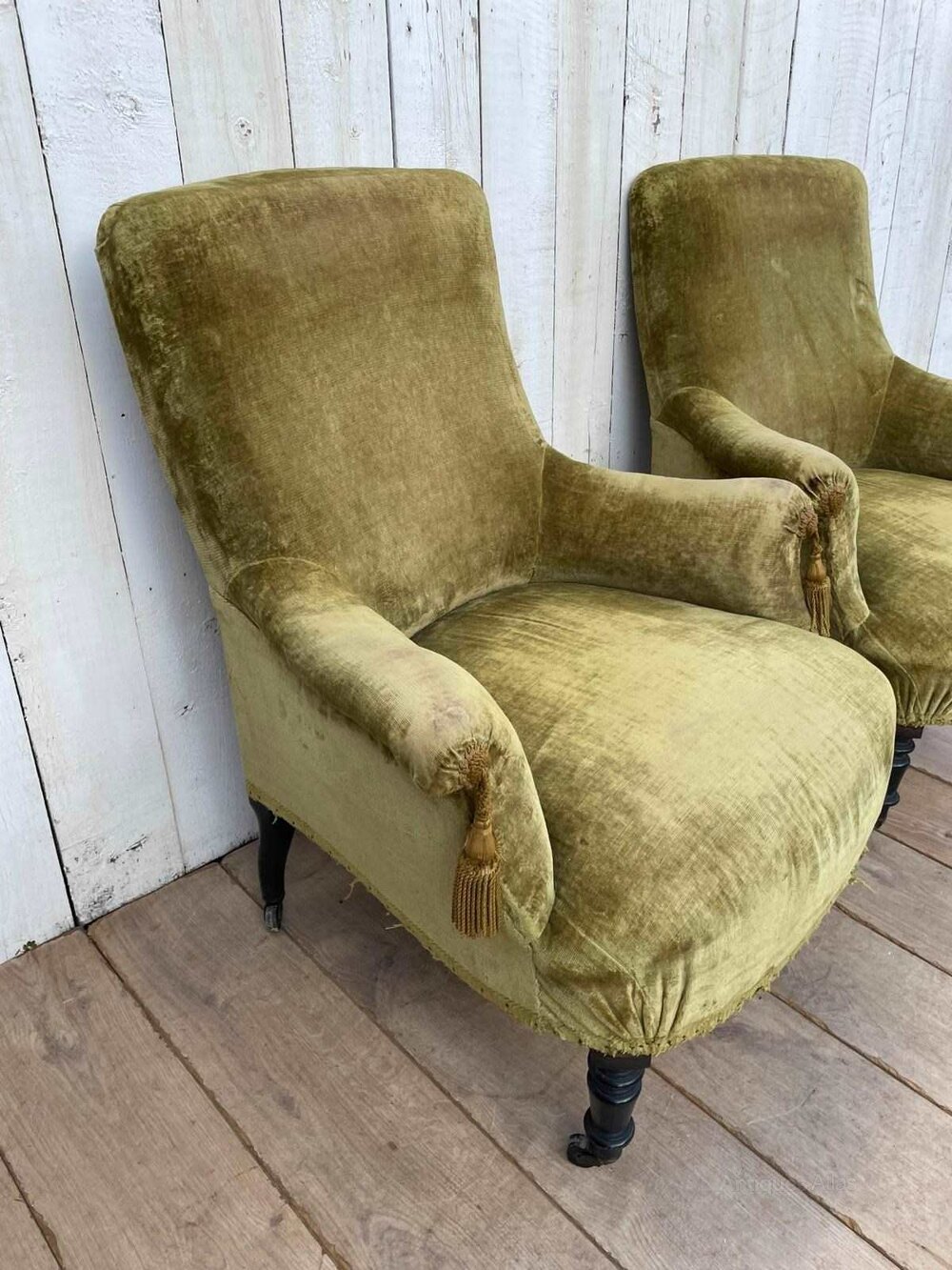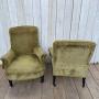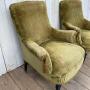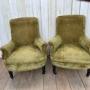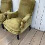 A pair of antique French Napoleon 111 tub chairs.They are sturdy, covered in green velvet upholstery with ebonised legs and original castors.