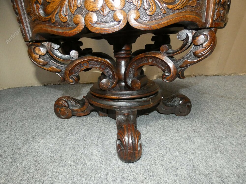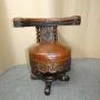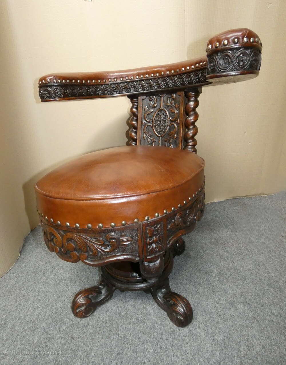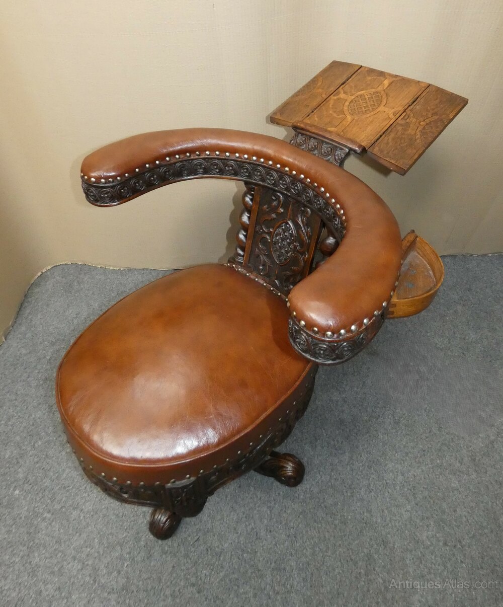 A rare and lovely quality oak cockfighting chair... this most unusual example is able to rotate 360 degrees and is designed to be able to be sat on facing forward or backwards and has a hidden shelf to the back which can be raised on supports to rest on and write bets, gambling results etc., there are concealed compartments in each arm plus a concealed drawer to the base at the back, the chair is wonderfully ornate with barley twist uprights and handsome carved details upholstered in brown leather with stud detailing, this fabulous chair really needs to be seen to be fully appreciated.Please contact us for further details.