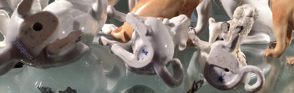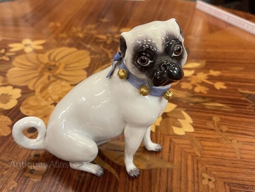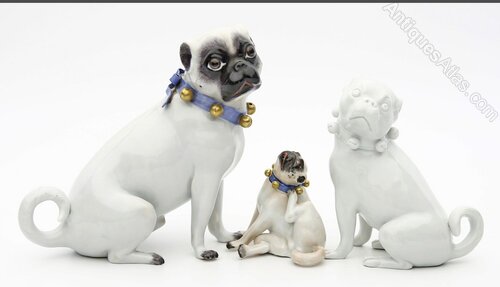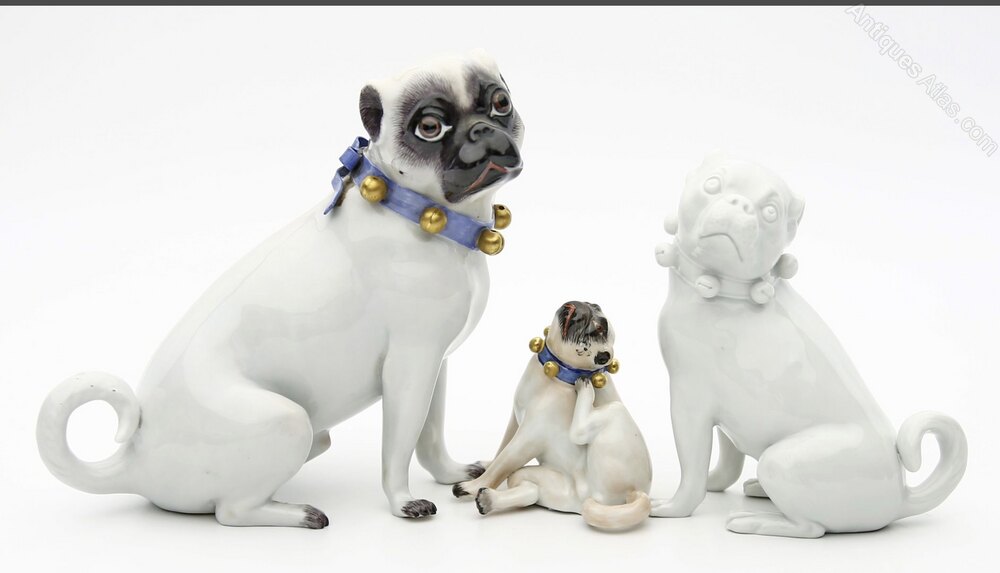 Three Porcelain Pugs the largest,Meissen 19th early 20th century, good condition, can be sold separately. Max height 12 cms. condition v. good. Meissen marks and nos.Preferred method of payment is by bank transfer (UK faster payment or to our €Euro account) which incurs no additional costs or charges.