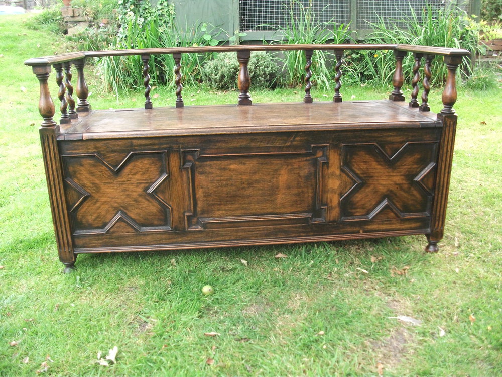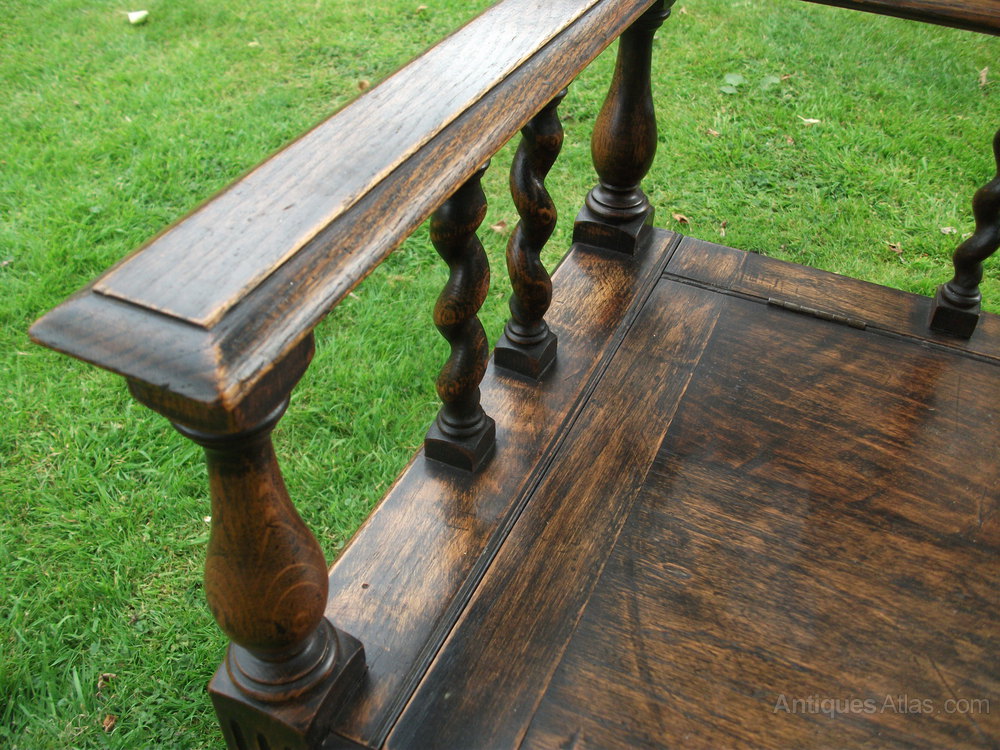 Excellent quality solid oak hall seat with barley twist back rest and full length shoe storage area under lift up seat.123 cm wide.