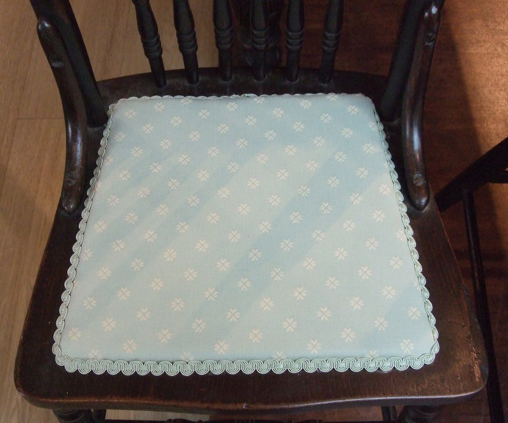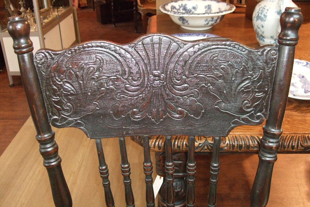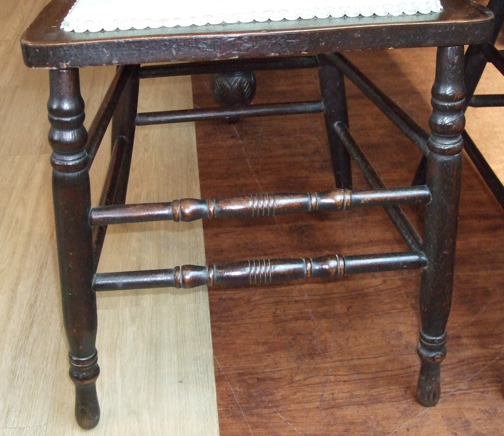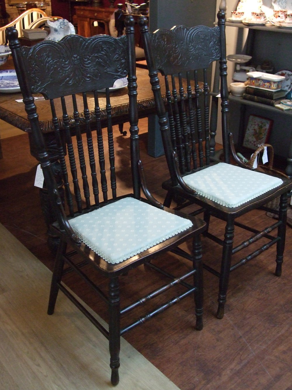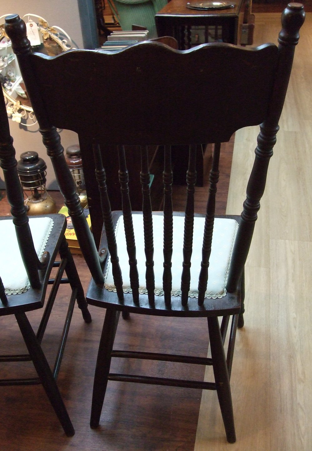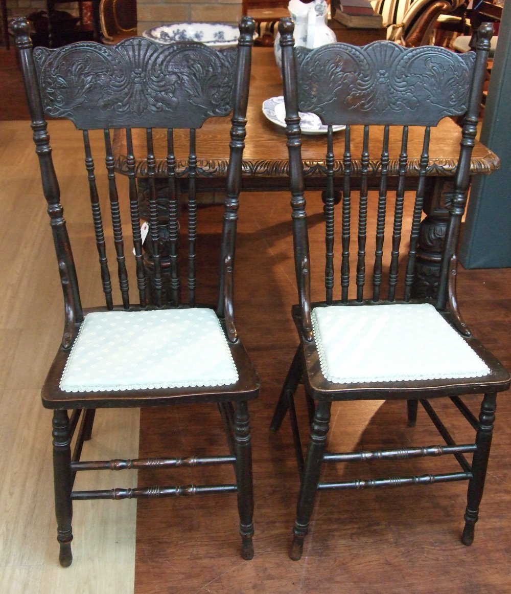 Pair of American spindle-back hardwood chairs with moulded, foliate pattern to the backrest and original paintwork. Pads upholstered with duck-egg blue contemporary fabric.DateLate 19th Century :