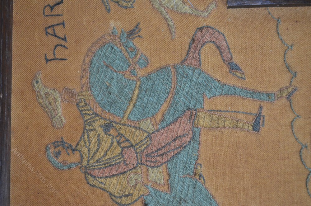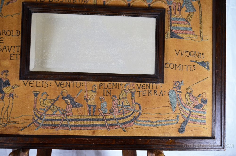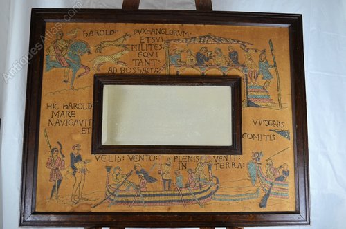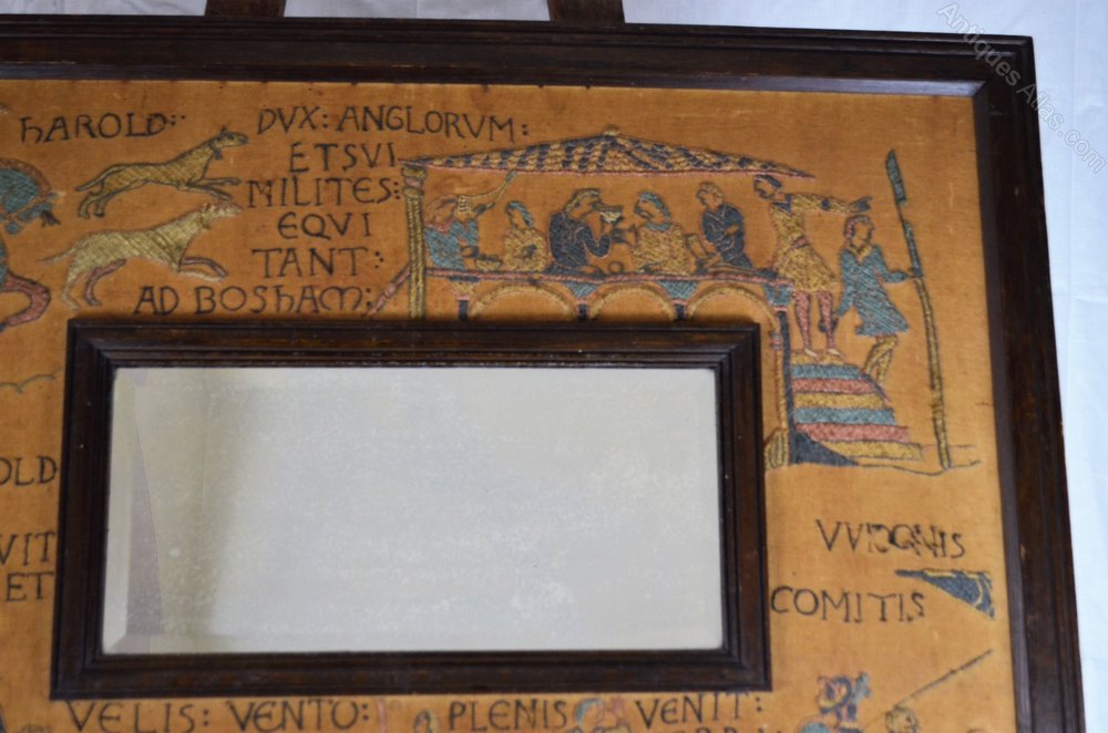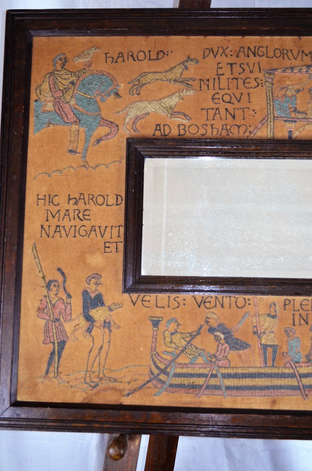 An unusual Arts and Crafts needlework, after The Bayeux Tapestry, mirror. Needlework depicts men on horse back, in boats and feasting with latin inscription. In an oak frame.DateArts and Crafts :