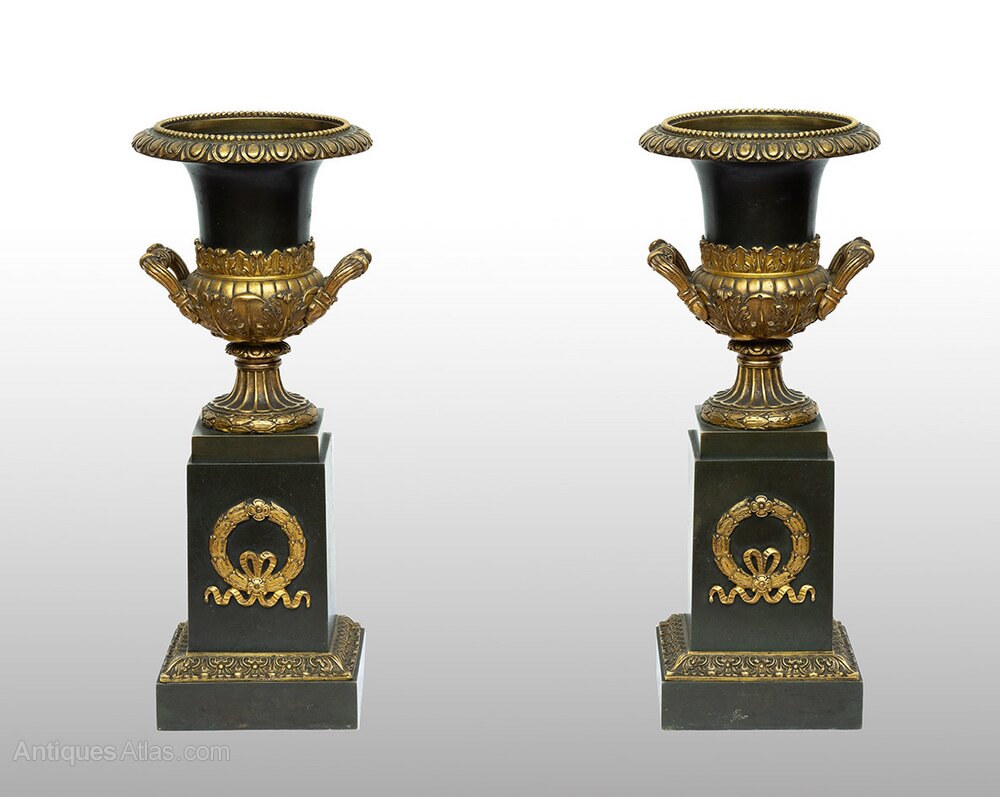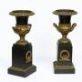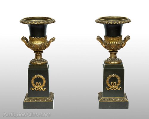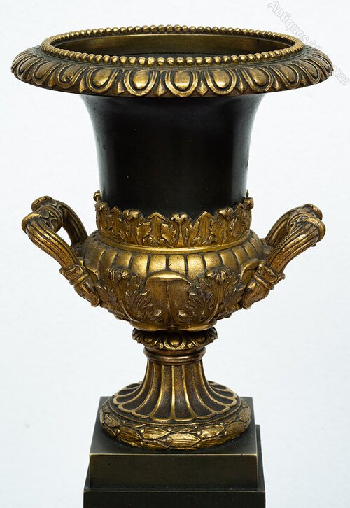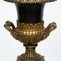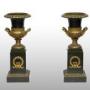 Description: Pair of antique Charles X French cassolettes in gilt bronze and patinated bronze, dating back to the early 19th century.The cup is adorned with two floral-motif handles and features a leaf-shaped motif at the bottom.
