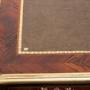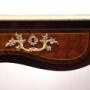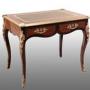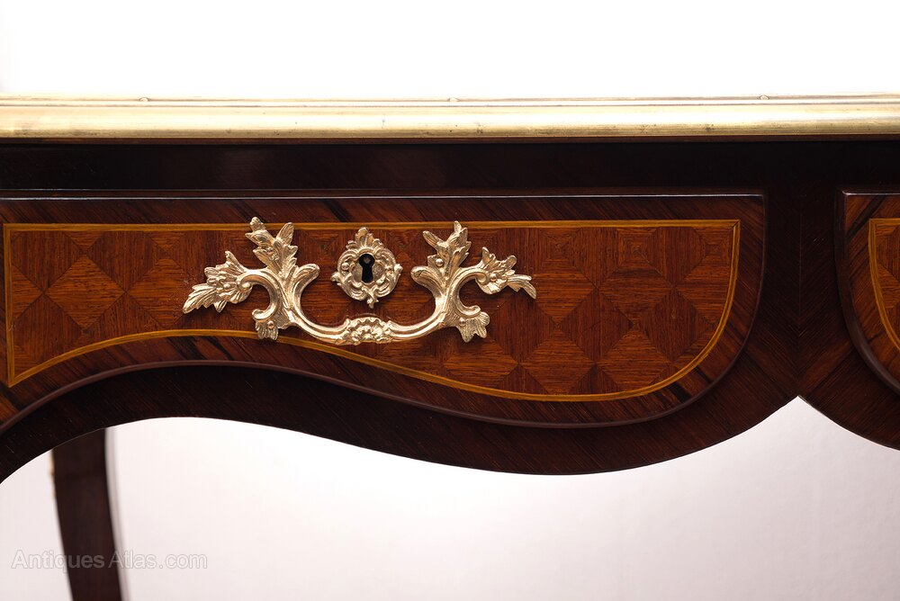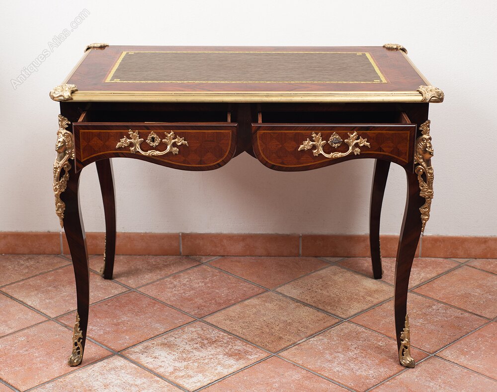 Description: Antique Napoleon III French writing desk in fine exotic wood with finely chiseled gilt bronze applications.The top features a chiseled leather covering surrounded by a gilt bronze border.