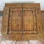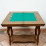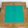 Description: Olive wood game table with exotic bone and mother-of-pearl inlays decorated with geometric patterns.The top rotates and unfolds into a game table, revealing a green felt mat.