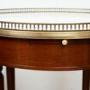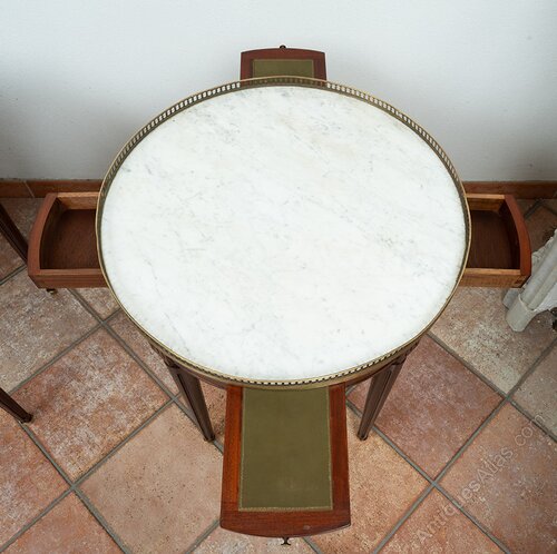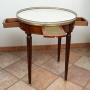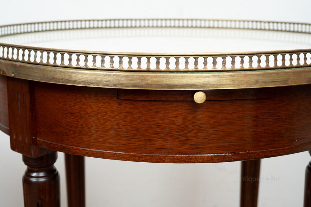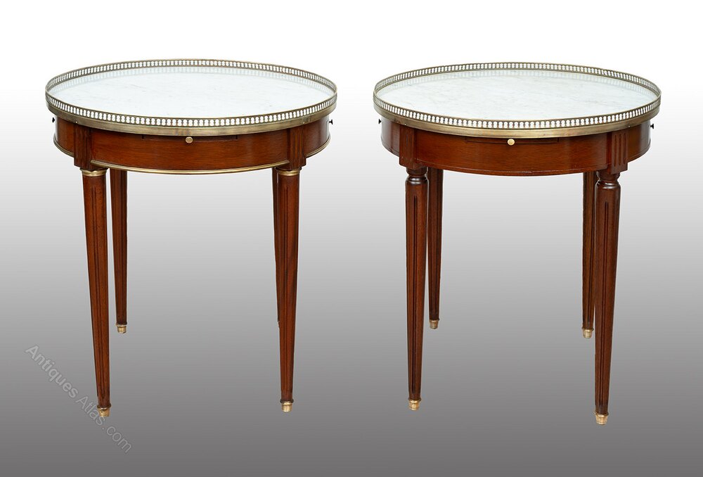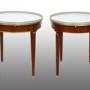 Description: A pair of antique Napoleon III solid mahogany coffee tables from the early 20th century.The circular top features a central white Carrara marble top surrounded by a bronze trim.