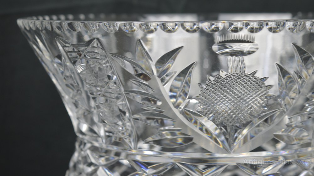 A true statement piece of mid 20th century crystal glassware. Based on a Georgian pedestal bowl of thistle form, these are often described as punch bowls, we don't think this one was ever intended for serving punch. It is a piece for display on a side/console table, maybe the centre of a dining table.A super, clear crystal with an unusual cut, the scallop cut rim tops a band of four panels each cut with a thistle and leaves motif. It is most unusual, one expects the more common wheel engraving, this is a deep cut design, the leaves all cut as deep 'v', the bulb and the flower head are first concave round/oval cuts that have been, in the case of the bulb further cross cut, the flower head remains plain then has the addition of vertical cuts on and above its top edge to depict the flower. Each panel is separated with a vertical 'ladder' form interspersed with eight point stars. The latter band is terminated at the waist and the bulbous bowl is then all over, large size, cross cut. The stem is plain with stacked squashed ball form, finishing with a star cut plain curved foot.