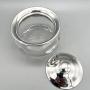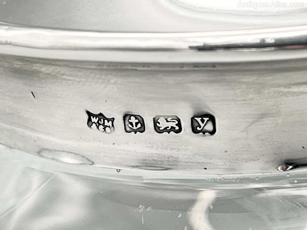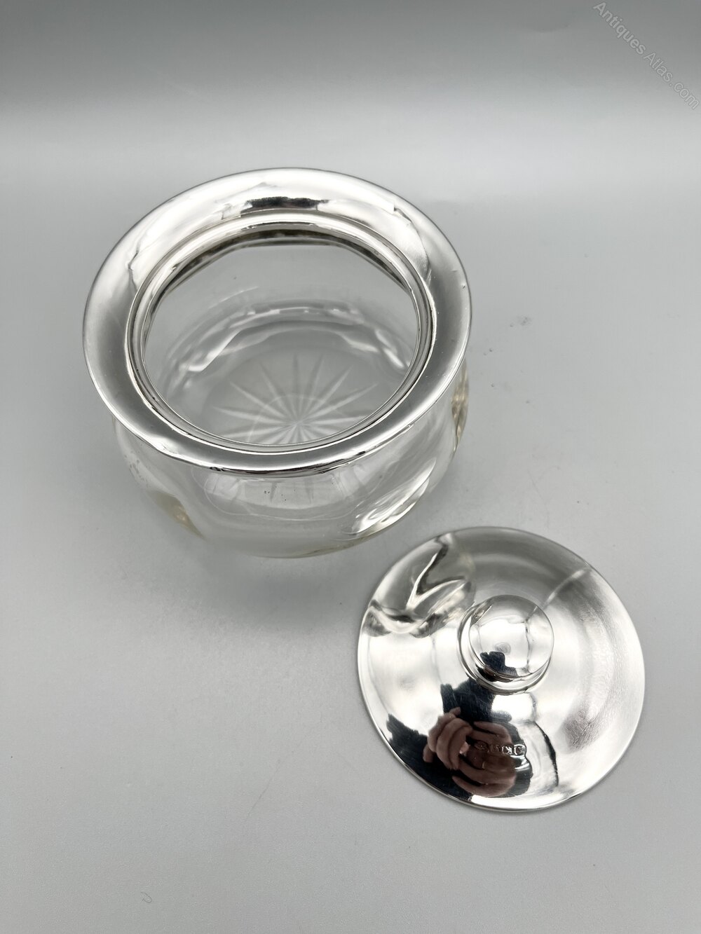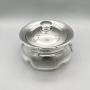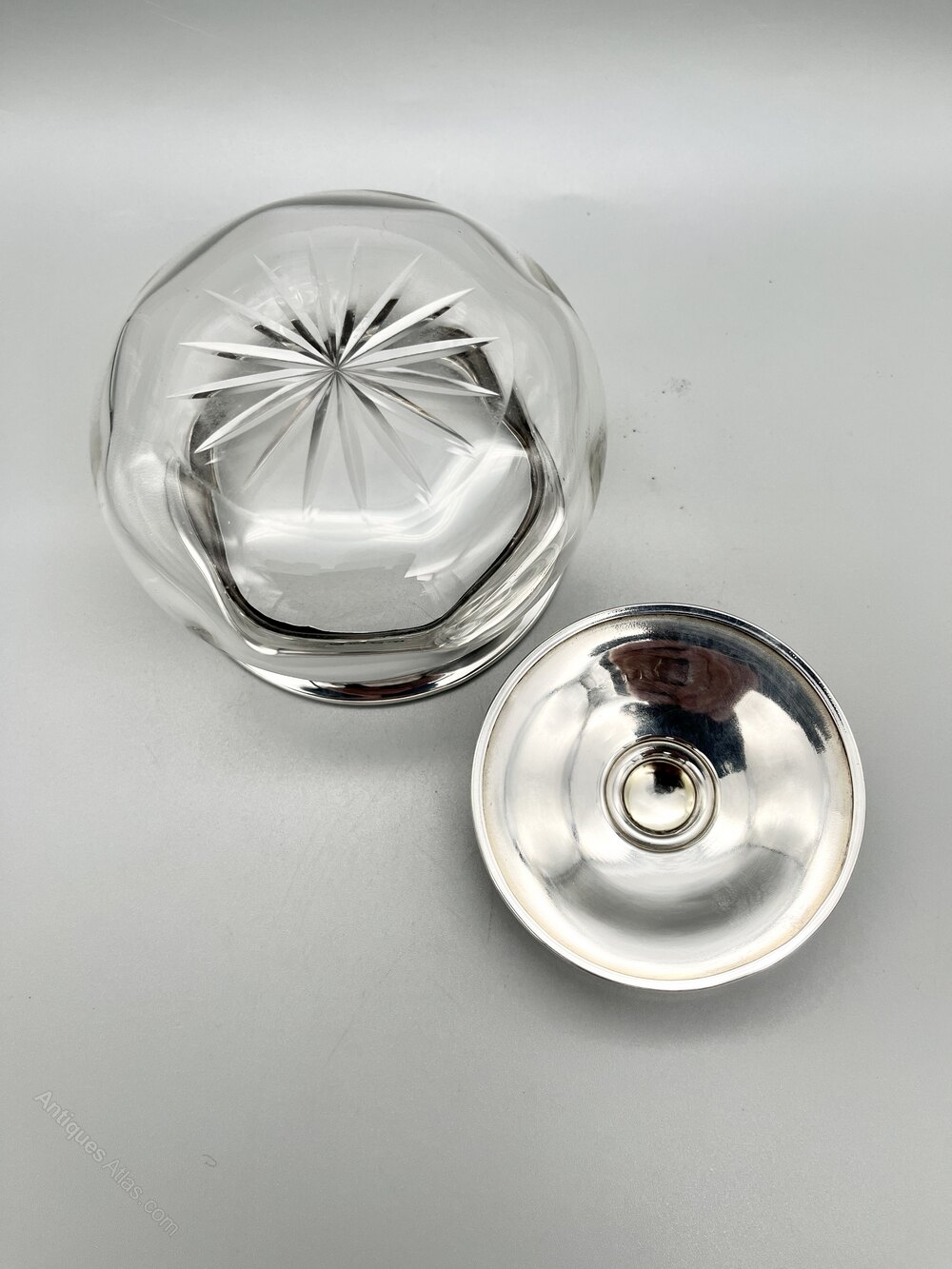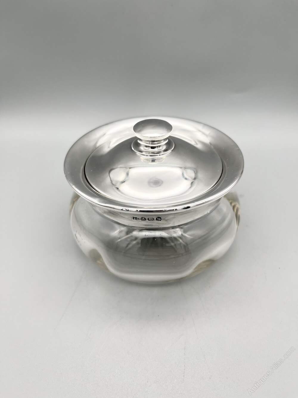 This is a stylish and practical George V Cut Glass and Sterling Silver Powder Bowl from the 1920s. The glass bowl is of lobed form with a star cut base and a broad silver splayed rim. The silver lid is circular with a flat topped handle. There are no initials or personalisation of any kind.The powder bowl was made in Birmingham by W.J. Myatt & Co and dates to 1923. The firm was founded in Birmingham by William James Myatt in 1895, initially as electroplaters. They became W.J. Myatt & Co in 1899, registered a silver mark at the Birmingham assay office and went on to open a showroom in London’s Hatton Garden. After WW2 they ceased producing Sterling Silver but continued to produce electroplate and pewter.