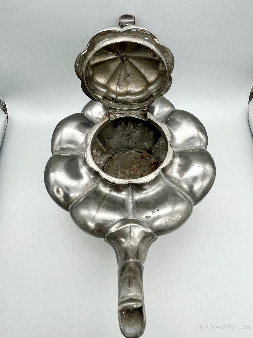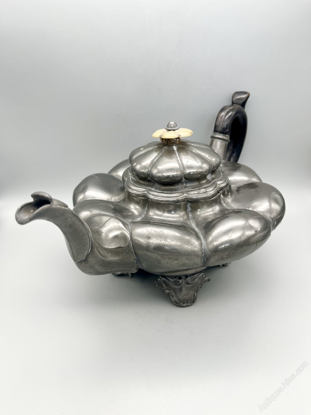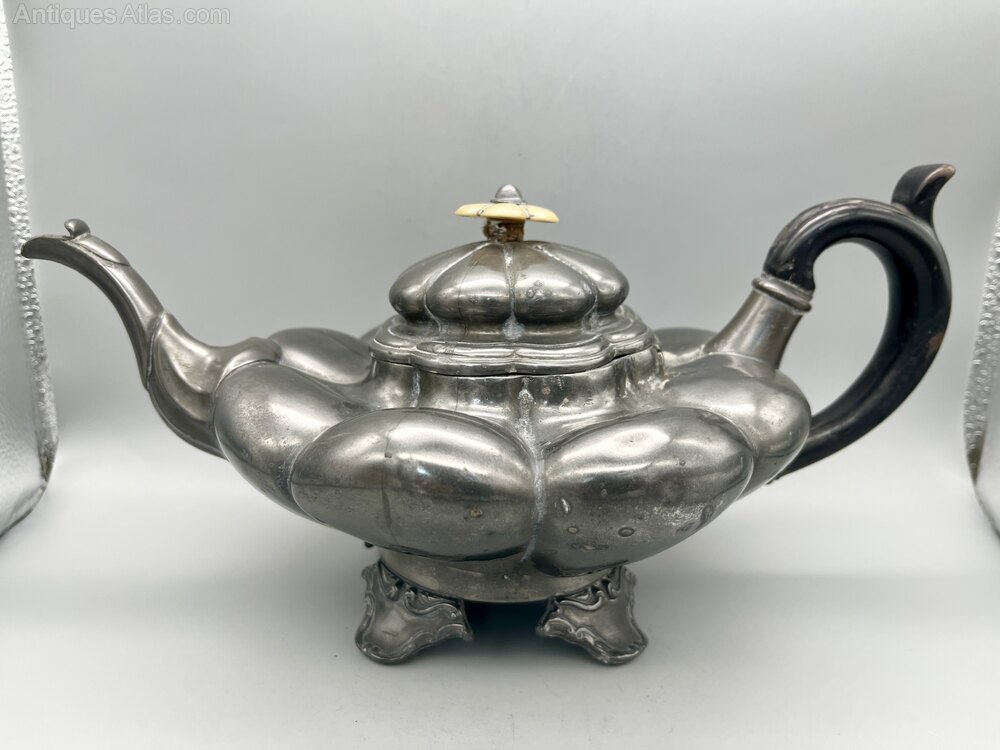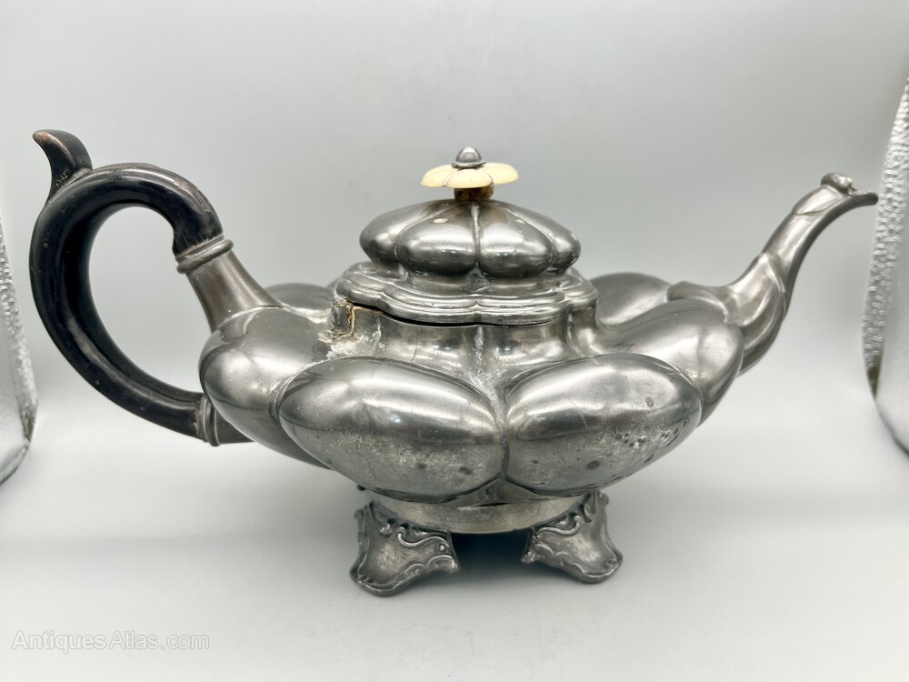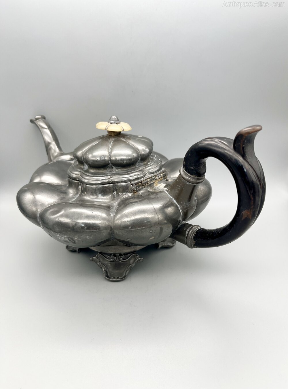 This is an unusual and distinctive William IV Pewter Teapot. The body of the teapot is of compressed lobed form with a circular base which stands on four scroll decorated bracket feet. The wooden handle is C-shaped with a top spur and the spout curves upwards. The hinged lid is lobed and has a matching mother of pearl finial. There are no initials or personalisation of any kind.The teapot was made in Sheffield by the famous firm of James Dixon & Son and dates to between around 1830 and 1835. The firm was founded around 1806 by James Dixon and Thomas Smith. Smith withdrew in 1824 and in the late 1820s William Dixon joined his father to create James Dixon & Son. A second son, James Dixon Jnr joined in 1835 and the firm was renamed James Dixon & Sons, the name it retained thereafter.