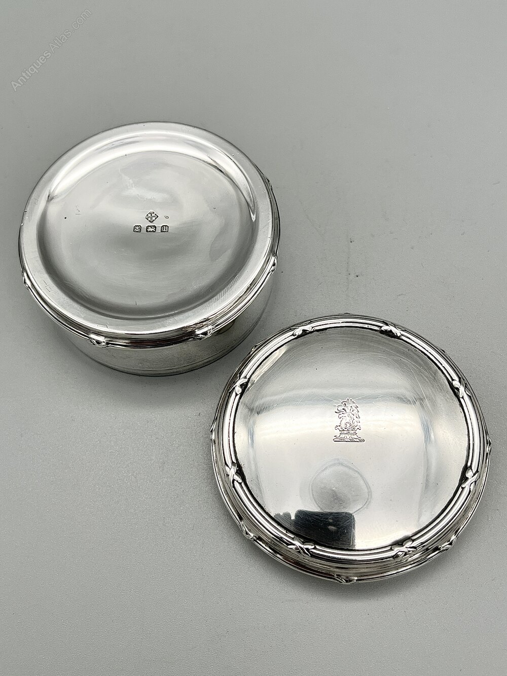 This is an attractive Edwardian Sterling Silver Trinket Box. The box is cylindrical with a lift off lid, which has a crest of a lion's head engraved on it. There are bands of thread and bow decoration around the lid and the bottom of the body. The interior of the box is gilded.The trinket box was made in Birmingham by Martin, Hall & Co and dates to 1910. The firm was founded by Richard Martin and brothers Ebenezer & Joshua Hall in 1854 as the successor to Roberts & Hall, in which Ebenezer had been a partner. The company manufactured in Sheffield and Birmingham and had showrooms in London, Birmingham, Glasgow and Sydney, Australia. They participated in many international exhibitions and won a number of awards. The firm went into decline with the economic downturn of the 1930s and had ceased trading by 1936.