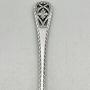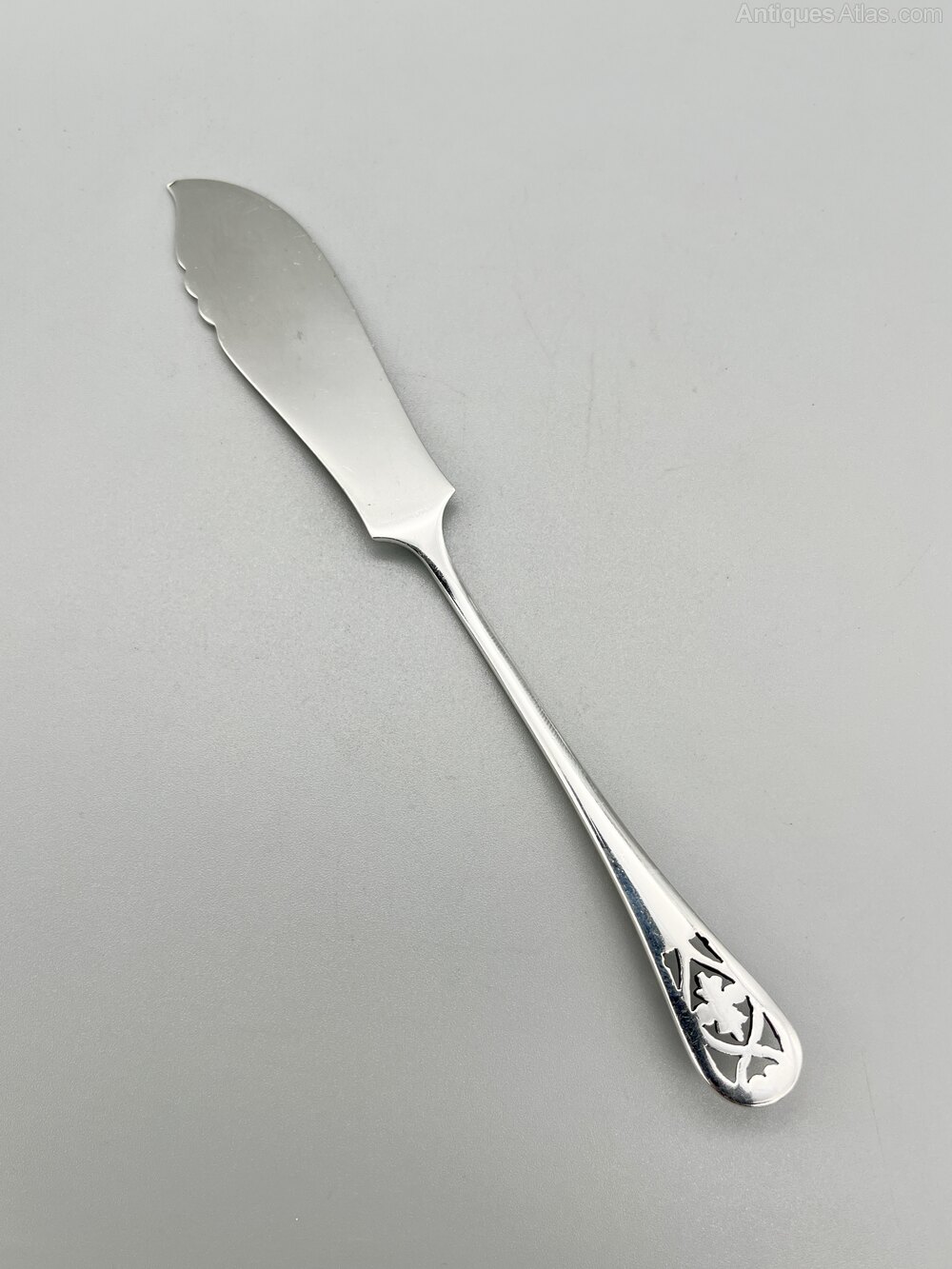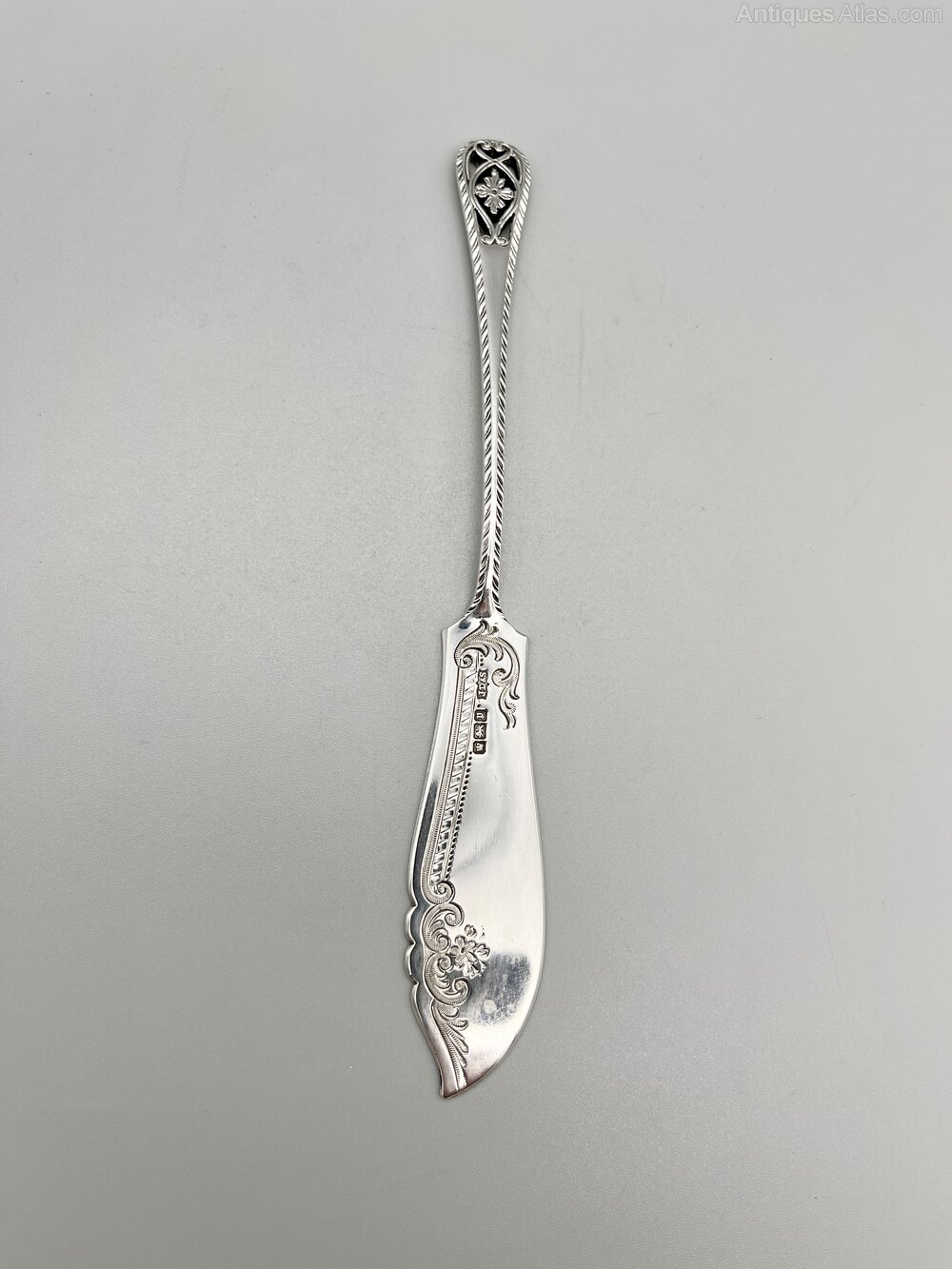 This is an elegant Edwardian Sterling Silver Butter Knife or Spreader. The knife has the classic scimitar shaped blade with engraved scroll and flower decoration. The stem has feathered edges and a pierced scroll and flower finial.The butter knife was made in Sheffield by well known silversmiths James Dixon & Sons and dates to 1907. With a history dating back to around 1806 when it was a partnership between James Dixon and Thomas Smith, James Dixon & Sons was one of Sheffield's foremost silversmiths and electroplaters, particularly noted for their relationship with designer Dr Christopher Dresser whose groundbreaking silver plate teapot designs for the company are still being reproduced today. They were highly successful and remained in business up until the mid 1980s when they were absorbed into British Silverware.