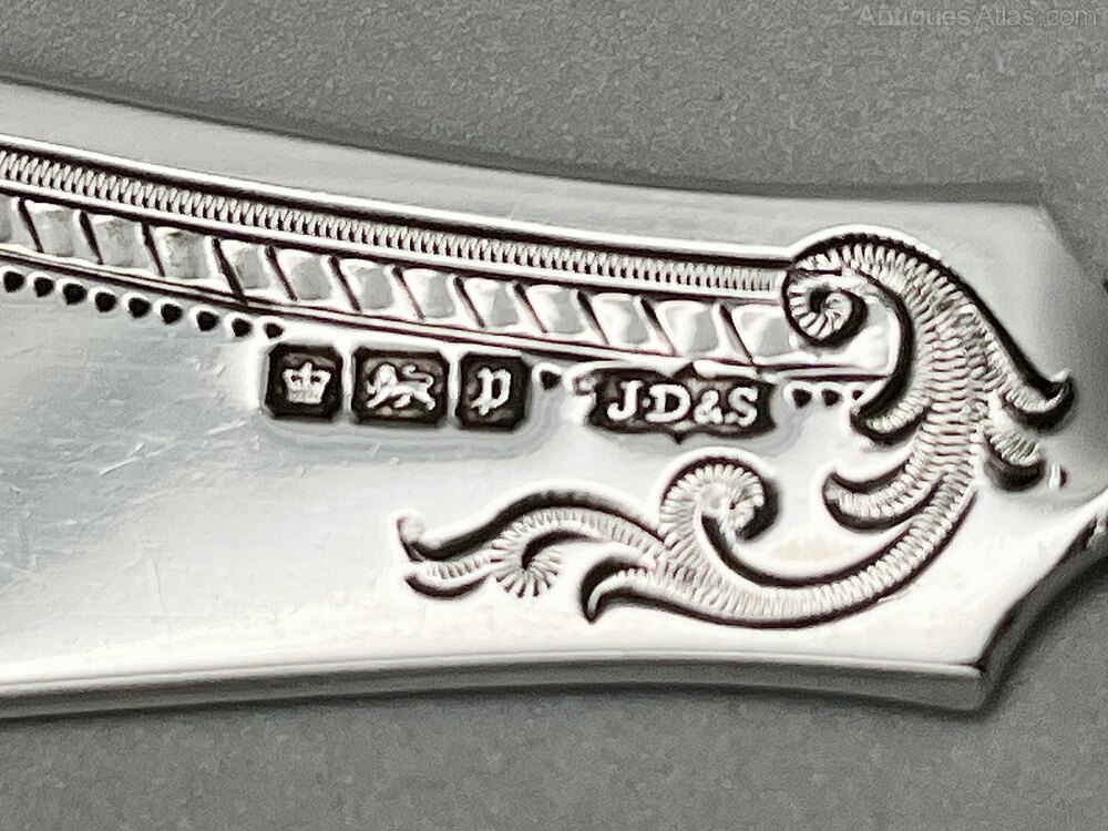 The hallmarks, on the front of the blade, are well struck and clear to read. They show the lion passant for Sterling Silver, the crown assay mark for Sheffield, the date letter p for 1907 and the J.D & S makers' mark for James Dixon & Sons.
