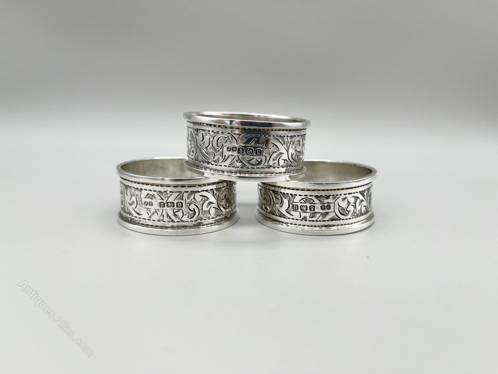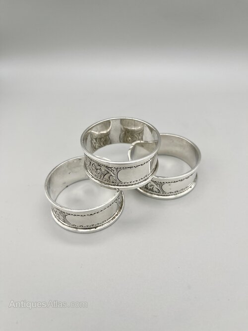 This is an attractive Set of Three George V Sterling Silver Napkin Rings. The rings are circular with an engraved design of scrolling acanthus leaves around the bodies and broad blank cartouches on the fronts.The napkin rings were made in Birmingham by silversmith John Rose and date to 1919. John Rose founded his firm at Hockley Street in Birmingham’s Jewellery Quarter in 1900. They quickly became successful and produced a wide range of silverware, particularly smoking accessories and tableware. The company remained in business into the late 1970s.