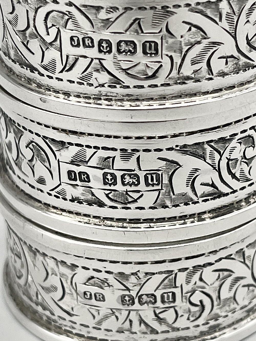 Each napkin ring is 4.5cm / 1.8ins in diameter and 1.8cm / 0.71ins deep. The three together weigh in at a respectable 59.6g / 2.1oz of solid Sterling Silver.